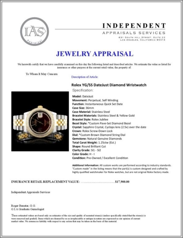 Regarding Appraised Jewelry and Loose Stones - Auctionfarm sends them out to a third party for Retail Replacement Value Appraisals, which are the most common. These types of evaluations are written for insurance needs. This would be the cost to replace the jewelry with an item of equal quality and kind, considered to be the current market price or the replacement value. This type of appraisal is done to protect you in the event of damage or loss of a valuable item. Our appraisals are conducted by independent 3rd Party appraisal firms that utilizes Certified GIA Gemologist. Appraisals should be used for verification of gemstone and/or metal weight, size, and grade only, not actual value. Appraisal value should be considered for insurance purposes only, not actual value, as price varies greatly from retail locations thru out the world. Items should not be purchased with the expectation to resell for appraisal price, or for profit.
