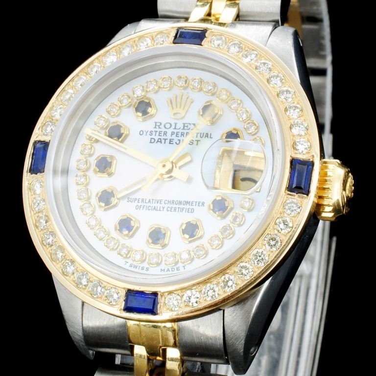 Dial: Custom White Mother of Pearl Diamond Dial with Sapphire Markers