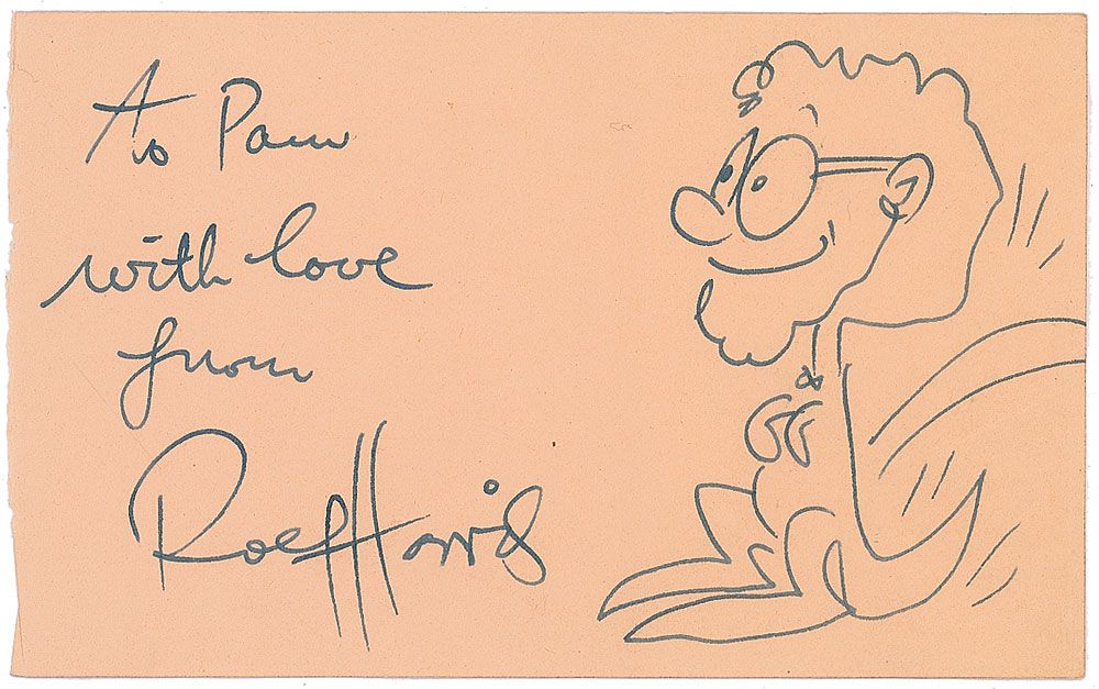 Singer-songwriter best known for the song ‘Tie Me Kangaroo Down, Sport.’ Original ink self-portrait caricature on a peach 5.5 x 3.25 album page, signed and inscribed, “To Pam, with love, from Rolf Harris.” In fine condition, with a couple mild creases. Accompanied by a certificate of authenticity from Tracks.