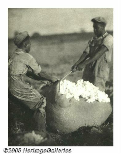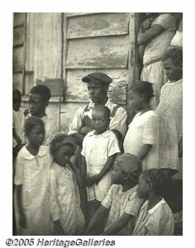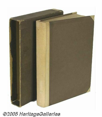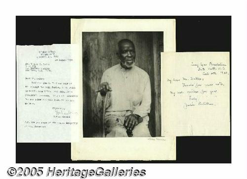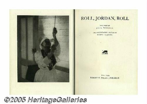 <B>"Roll, Jordan, Roll," First Edition Book by Doris Ulmann and Julia Peterkin</B></I> (New York: Robert O. Ballou, 1933, the deluxe edition of 350 signed and numbered copies). <I>"Some of the charm that made the life of the old South glamorous still lingers on a few plantations that have been so cut off from the outside world by rivers, wide swamps and lack of roads they are still undisturbed by the restless present. Wistfully holding to the past when they were part of a civilization never excelled in America, they keep their backs turned to the future and persistently ignore that strange thing called progress, which so often means change without betterment."</B></I> Thus opens this landmark work with text by Pulitzer Prize winning author Julia Peterkin and 90 hand-pulled photogravures from photographs taken by Doris Ulmann. <I>Roll, Jordan, Roll</B></I> was critically acclaimed as one of the first books to portray African Americans as people rather than stereotypes. W. E. B. Du Bois stated, <I>"Peterkin is a Southern white woman, but she has the eye and the ear to see beauty and know truth."</B></I> This edition has stamped brown boards with linen spine and corners, 341 pages, large quarto in size, top edges gilt. Both Julia Peterkin and Doris Ulmann have signed in ink on the colophon. Book is in fine, tight condition. The matching brown board slipcase is present but has a bit of staining and chipping as is common. This particular copy has extremely desirable provenance as it is number ten (of 350) and was originally owned by the author herself. Included with this rare edition is a one-page autograph note signed by Julia Peterkin dated 1930 from her Lang Syne Plantation address in South Carolina, together with an additional photogravure, loose, signed by the photographer in pencil in the margin. A 1980 letter to a previous owner from a South Carolina bookseller documents that this book was purchased from William Peterkin, Julia's grandson. Another copy of this edition sold last year at a major New York auction firm for $57,600 and that was without the Peterkin association! A knowledgeable dealer who examined that copy and this present example found this one to be in more appealing condition overall. Lot:250