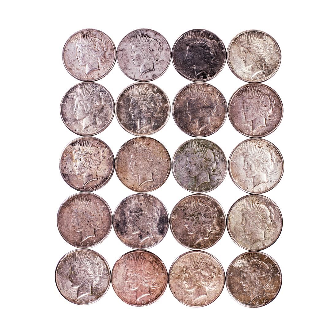 One Roll of (20) 1925-S $1 Peace Silver Dollar Coins Circulated.