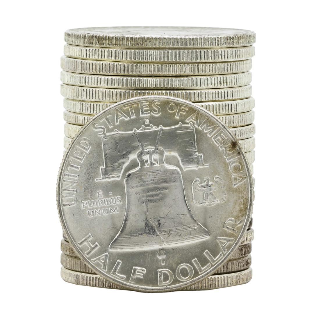 One Roll of (20) 1961-D Brilliant Uncirculated Franklin Half Dollar Coins.