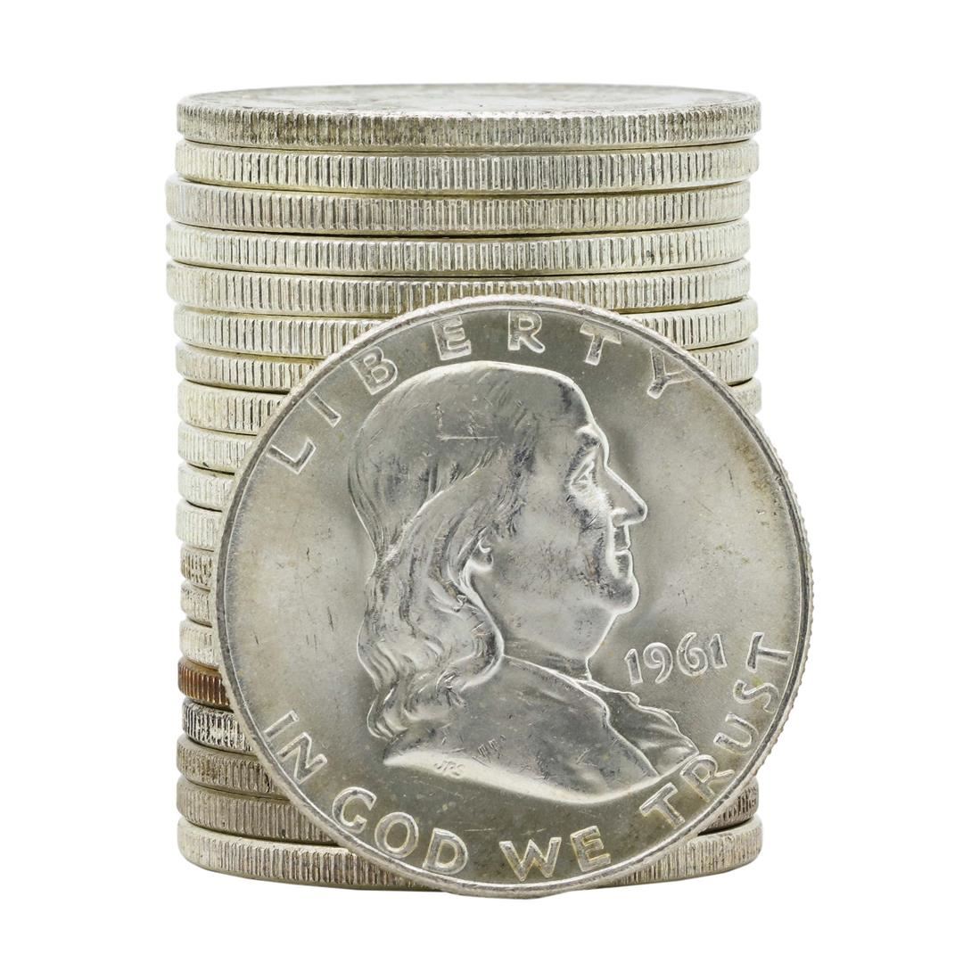 One Roll of (20) 1961-D Brilliant Uncirculated Franklin Half Dollar Coins.
