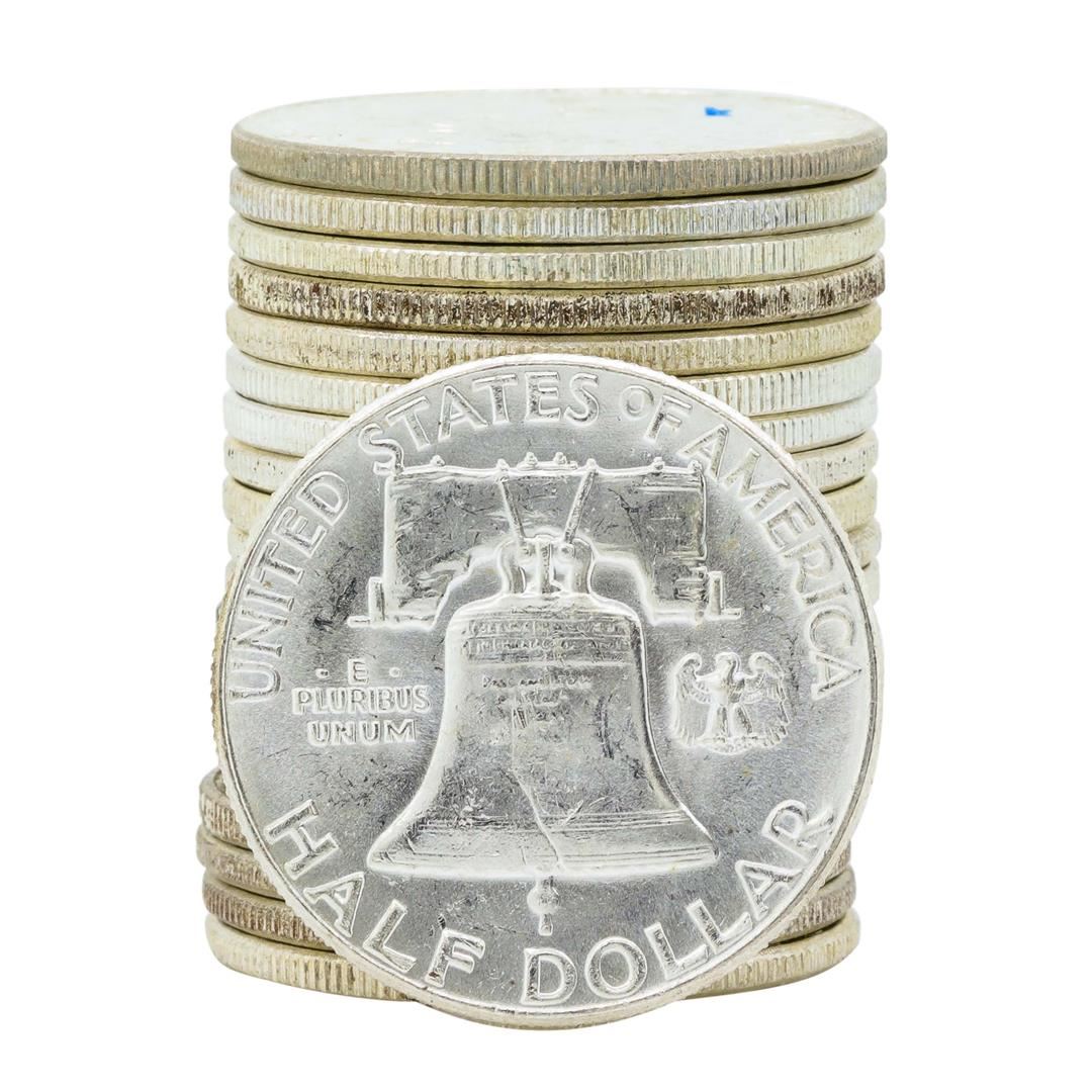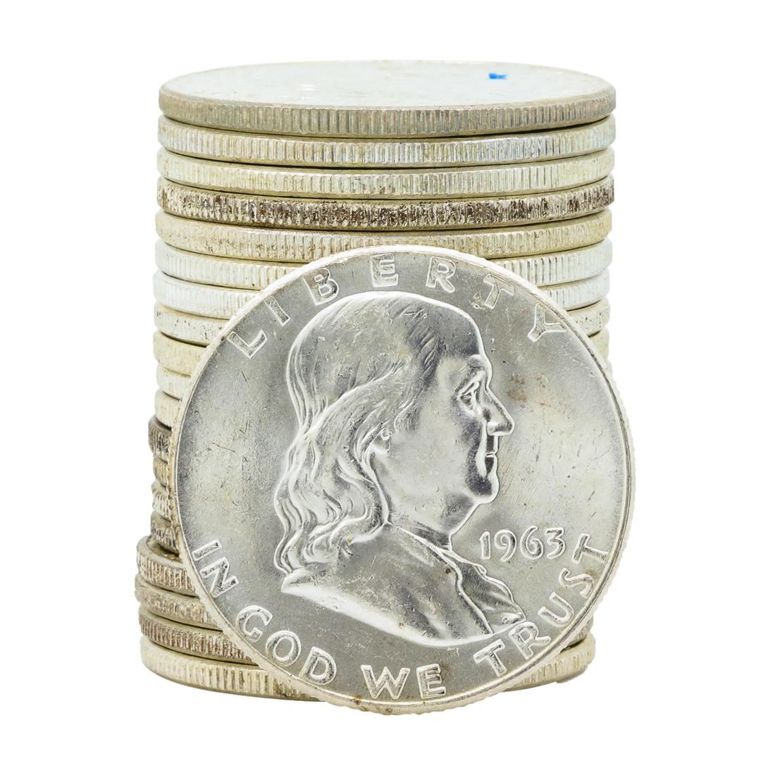 One Roll of (20) 1963 Brilliant Uncirculated Franklin Half Dollar Coins.