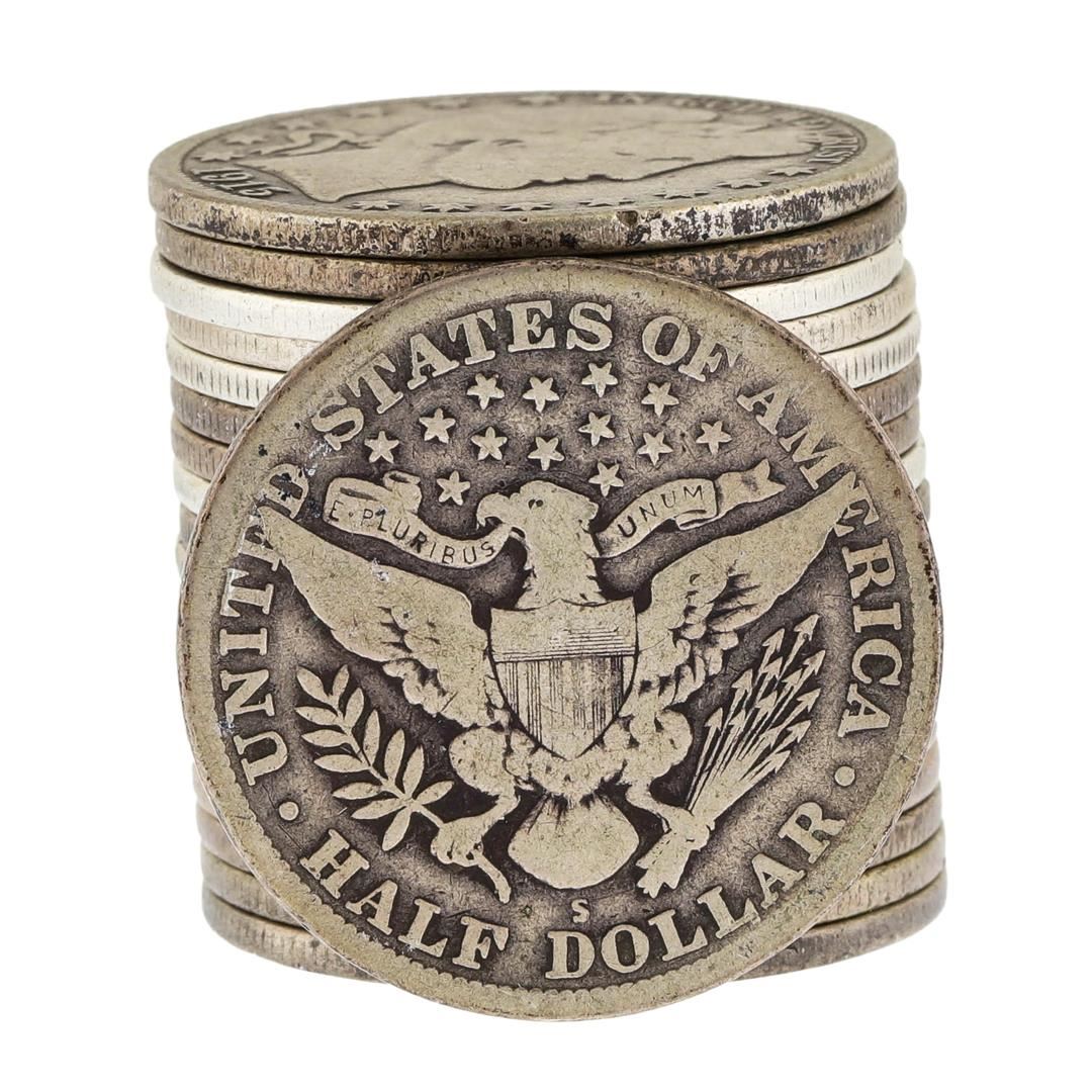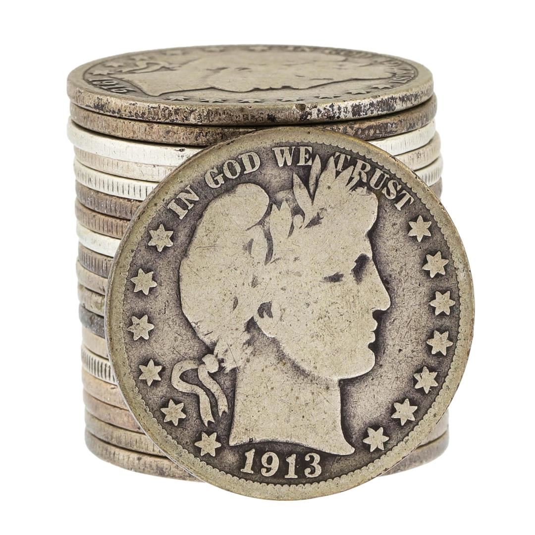 One Roll of (20) Barber Half Dollar Coins - Circulated.