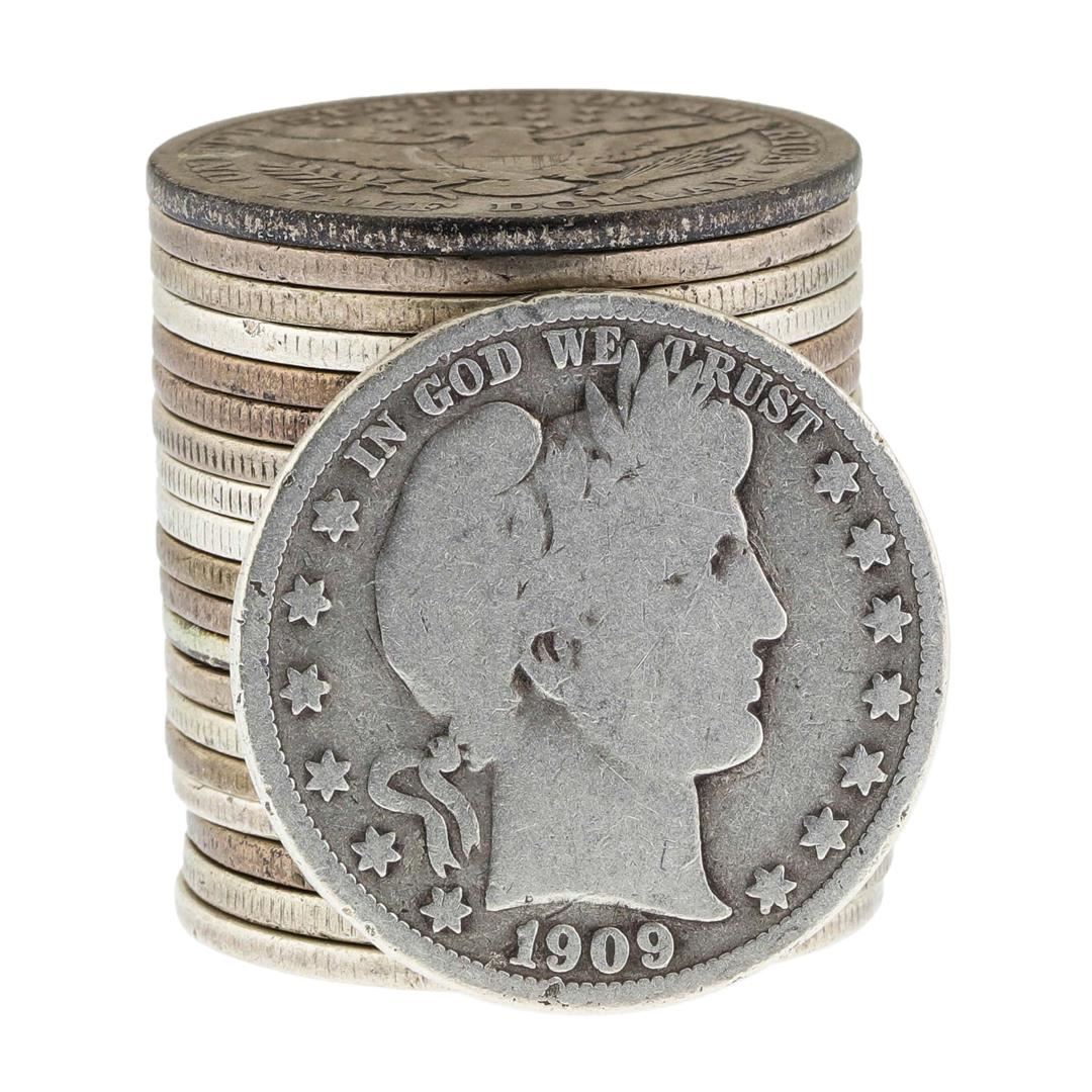 One Roll of (20) Barber Half Dollar Coins - Circulated.