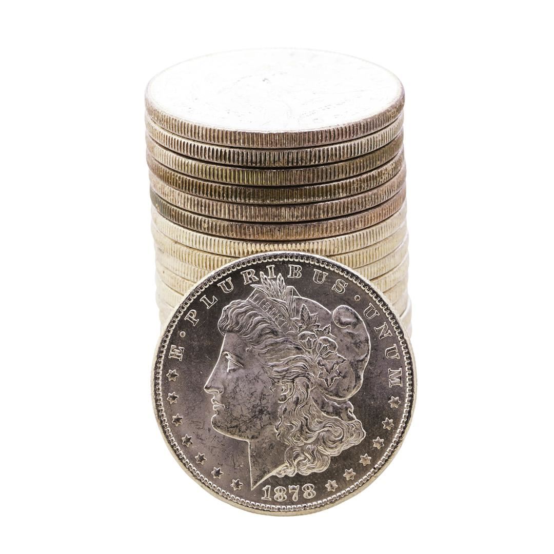 One Roll of (20) Brilliant Uncirculated 1878-S $1 Morgan Silver Dollar Coins.
