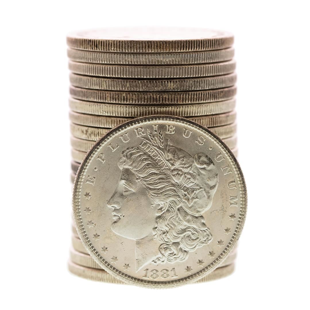 One Roll of (20) Brilliant Uncirculated 1881-S $1 Morgan Silver Dollar Coins.