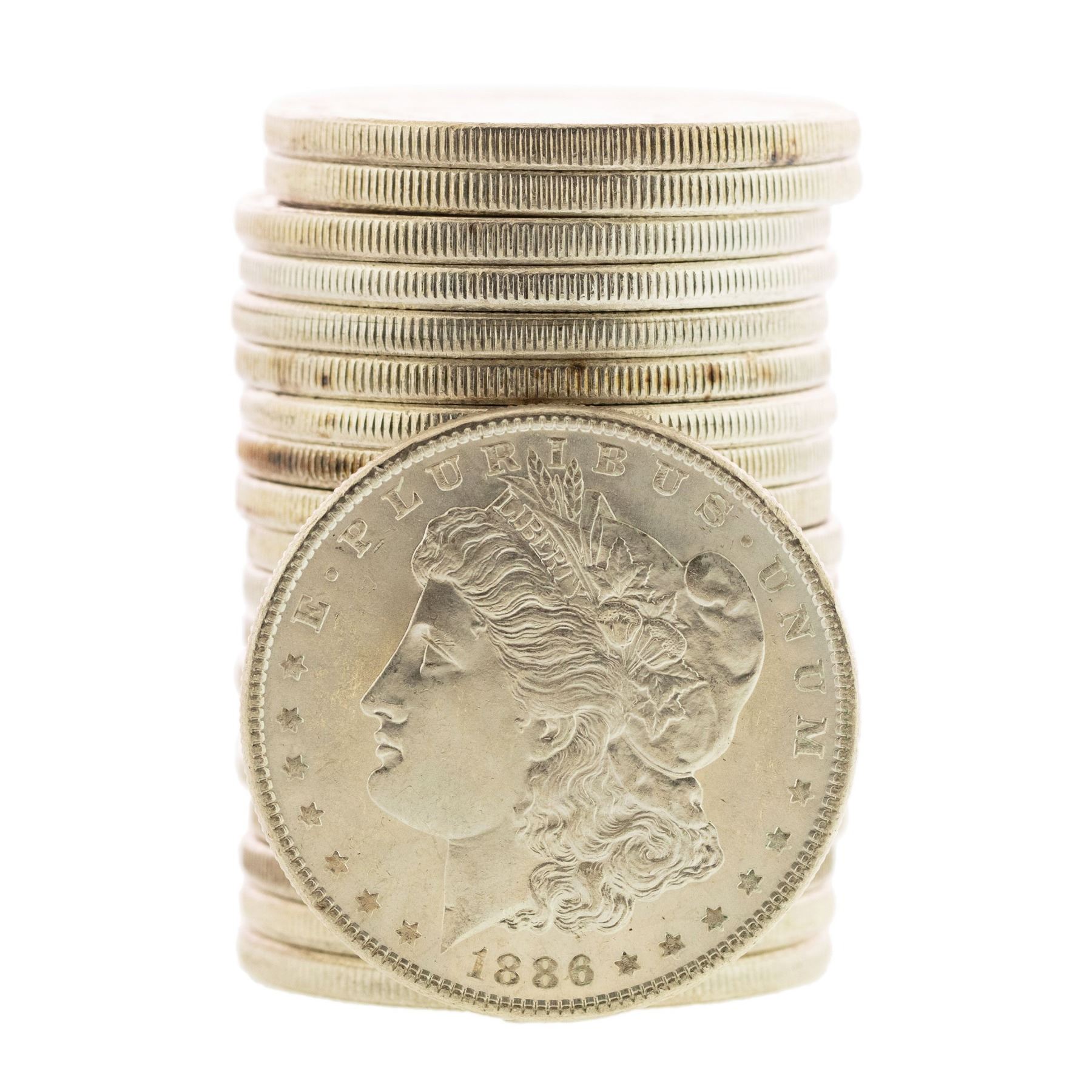 One Roll of (20) Brilliant Uncirculated 1886 $1 Morgan Silver Dollar Coins.