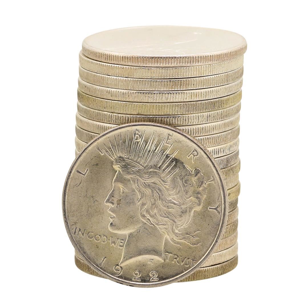 Roll of (20) Brilliant Uncirculated 1922 $1 Peace Silver Dollar Coins