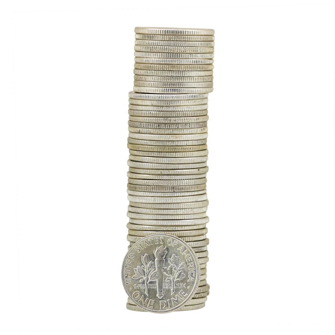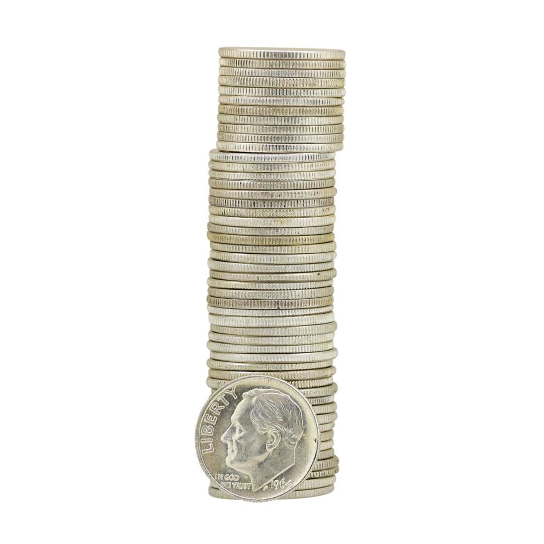 One Roll of (50) 1964-D Brilliant Uncirculated Roosevelt Dimes.
