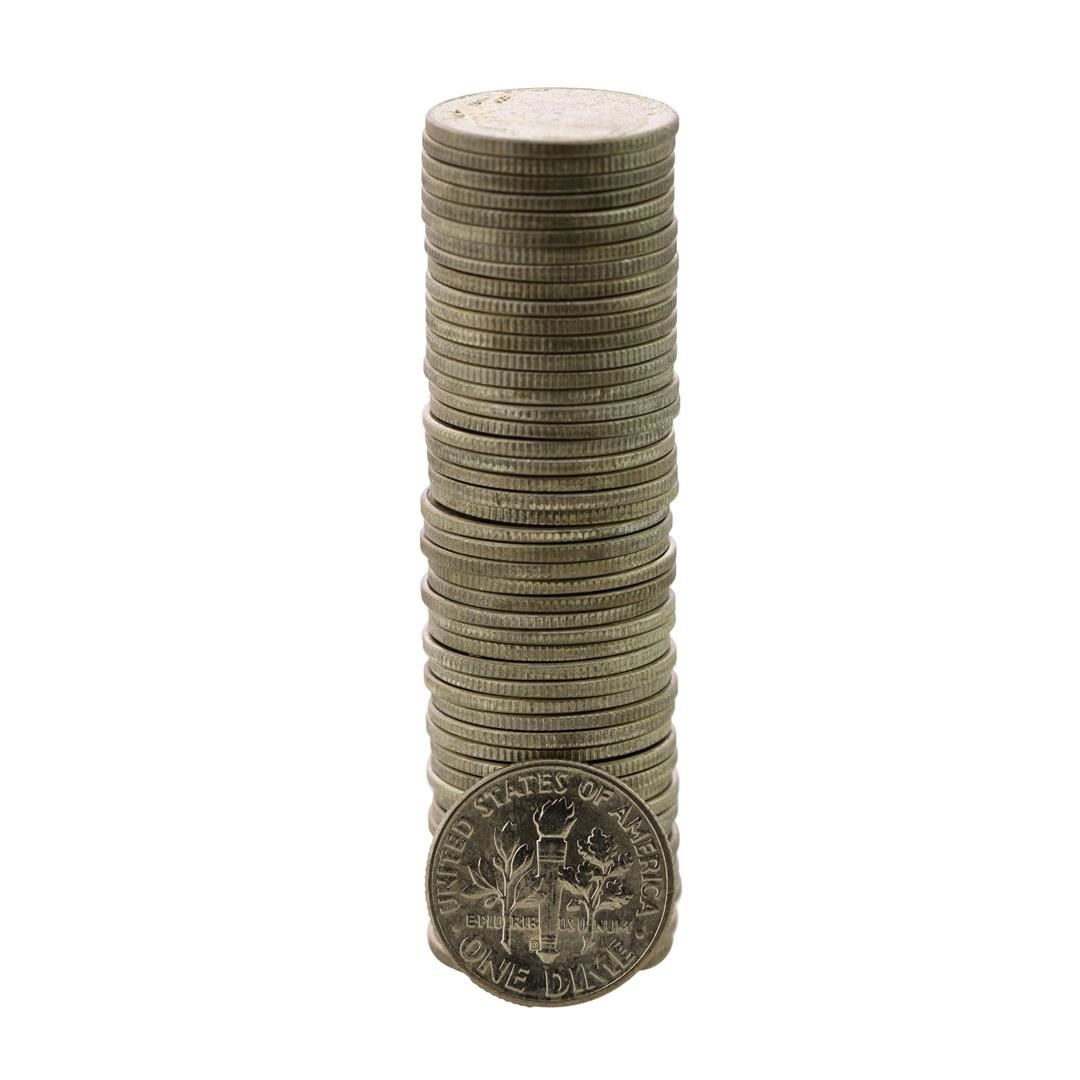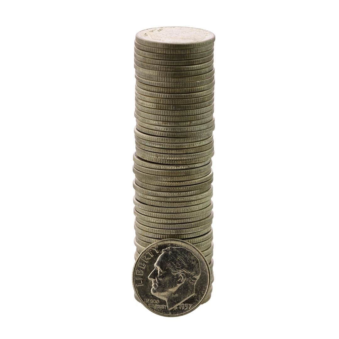 One Roll of (50) Brilliant Uncirculated 1957-D Roosevelt Dime Coins.