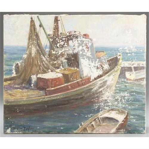 <B>ROLLA TAYLOR (American, 1872-1970)</B></I><BR><I>Shrimper, Rockport</B></I>, 1960<BR>Oil on canvas<BR>20 x 24 inches (50.8 x 61.0 cm)<BR>Signed lower left: <I>Rolla Taylor/60</B></I><BR> <BR>PROVENANCE:<BR>Estate of Rolla Taylor<BR><B>Condition Report:</B> Unlined, craquelure and severe paint losses throughout.<BR><BR><b>Shipping:</b> Miscellaneous Collectibles, Smal (<a target="_blank" href="http://www.heritageauctions.com/common/shipping.php">view shipping information</a>)