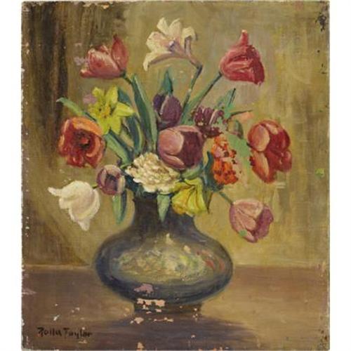 <B>Rolla Taylor</B></I> (American 1871-1970)<B><BR></B></I><I>Spring Flowers, Floral Still Life<BR></B></I>Oil on canvas<BR>16 x 14 inches (40.6 x 35.6 cm)<BR>Signed lower left <I>Rolla Taylor<BR></B></I>Labeled verso: <I>Spring Flowers/by/Rolla Taylor<BR></B></I> <BR>Rolla Taylor was born in Galveston, Texas, and began painting at the age of 14. Encouraged in his artistic endeavors, Taylor graduated from the Cuero Institute (also known as the Guadalupe Academy or Nash's School, for founder Professor David W. Nash), and went on to study with Robert Jenkins Onderdonk, Jose Arpa, and Theodore Gentilz. He later studied briefly in France, and then with Arthur W. Best in San Francisco, and Frederick Fursman in Michigan. Taylor exhibited extensively for 60 years at numerous local, state and national exhibitions throughout America.<BR><BR>Provenance:<BR>Estate of Rolla Taylor;<BR>By descent to Leann Simpson<BR> <B>Condition Report:</B> Various areas of paint flaking.<BR><BR><b>Shipping:</b> Framed - without Glass, Small (<a target="_blank" href="http://www.heritageauctions.com/common/shipping.php">view shipping information</a>)