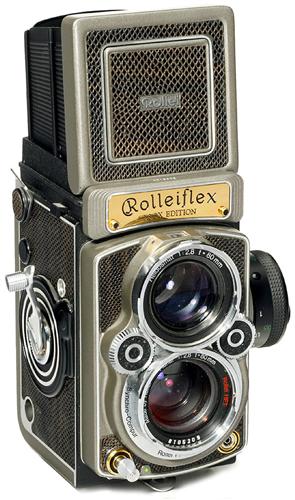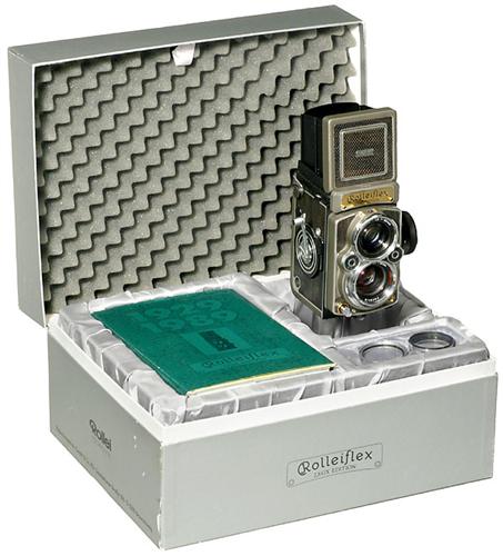 Rolleiflex 2,8 GX Edition, 1989 Rollei, Brunswick, limited edition to celebrate 60 years of Rolleiflex (1929-1989). Rollei HFT "Planar 2,8/80". With lens cap (same color). "Rolleinar-1" close-up lenses, test certificate, warranty document, instructions and Rollei book (German). Box slightly damaged, everything else in excellent condition. Top collector's item.<Br>