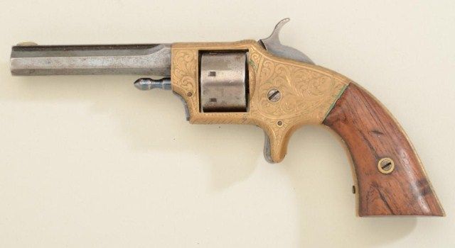 Rollin-White made for Smith & Wesson single action revolver, .22 cal., #8846; blue and gold with period original scroll engraving; very good + condition; 75-85% blue on barrel drifted on cylinder, traces of gold on frame; good grips. Est.: $300-$600.