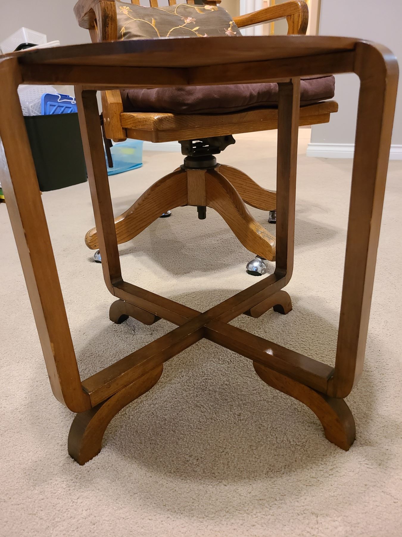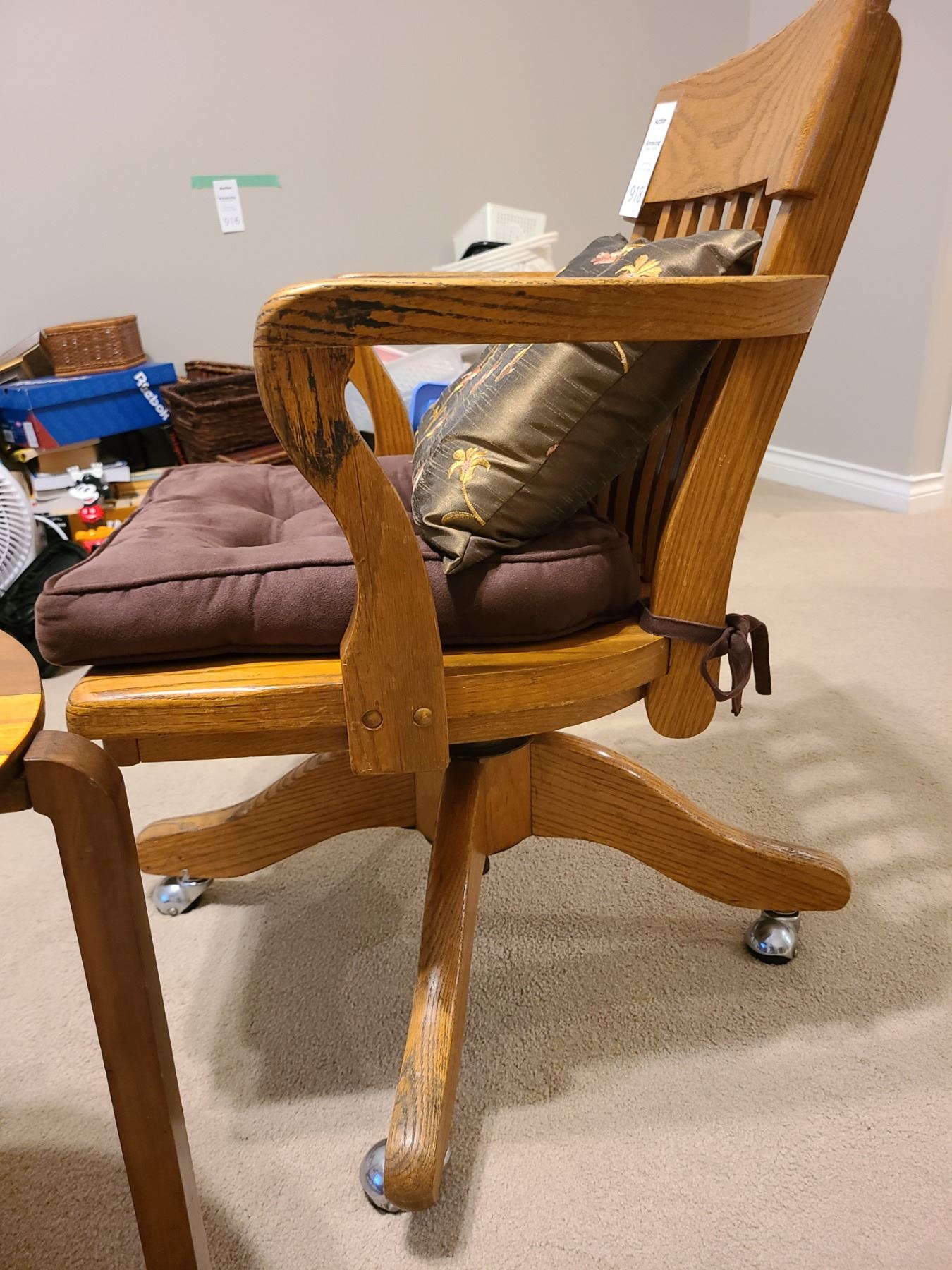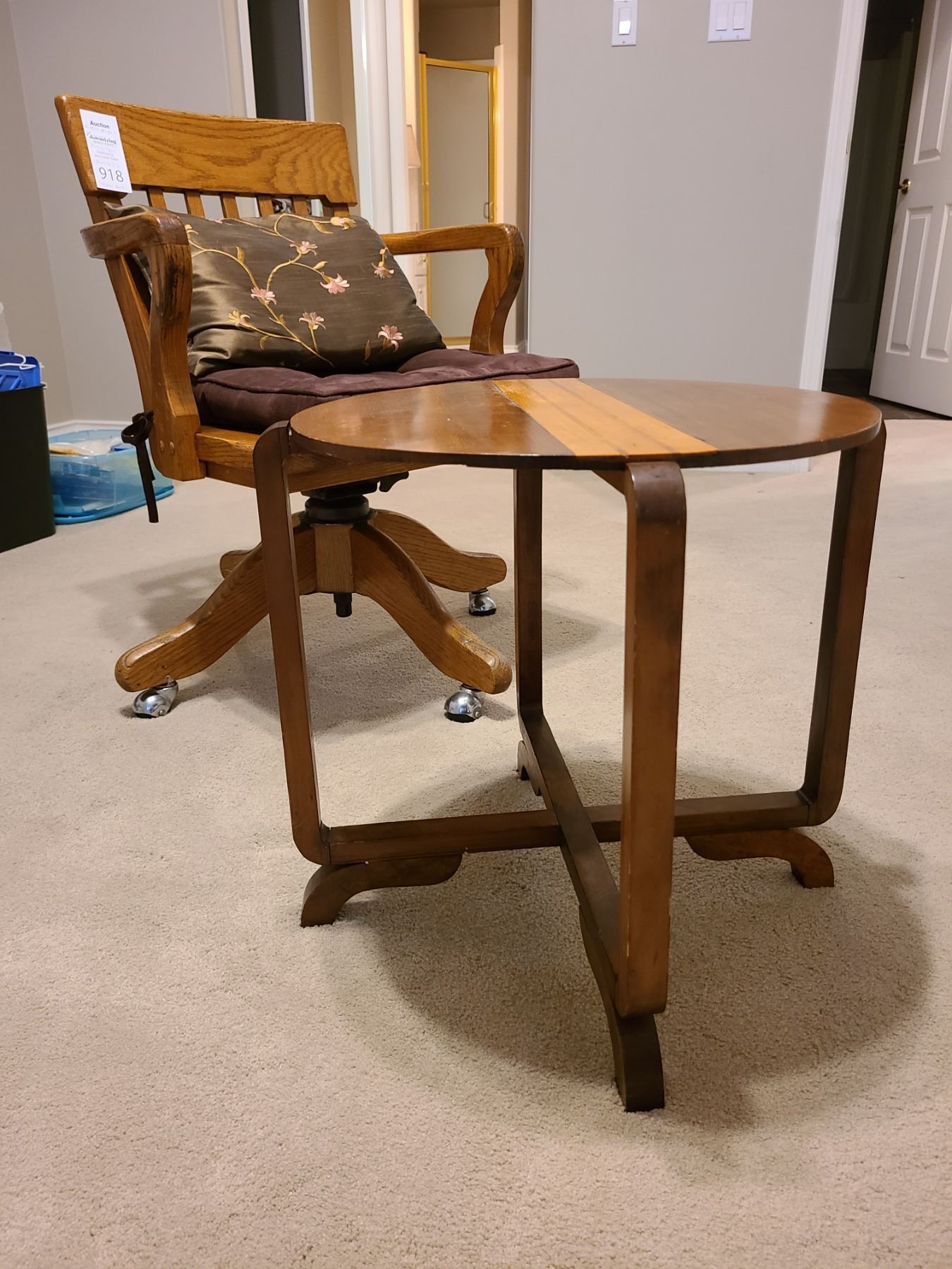 Rolling wood chair by Brooks Corning 21x19x32 with small round table 18x18x19. Chair has chip on back. Bring help to move. Pickup 11 am.