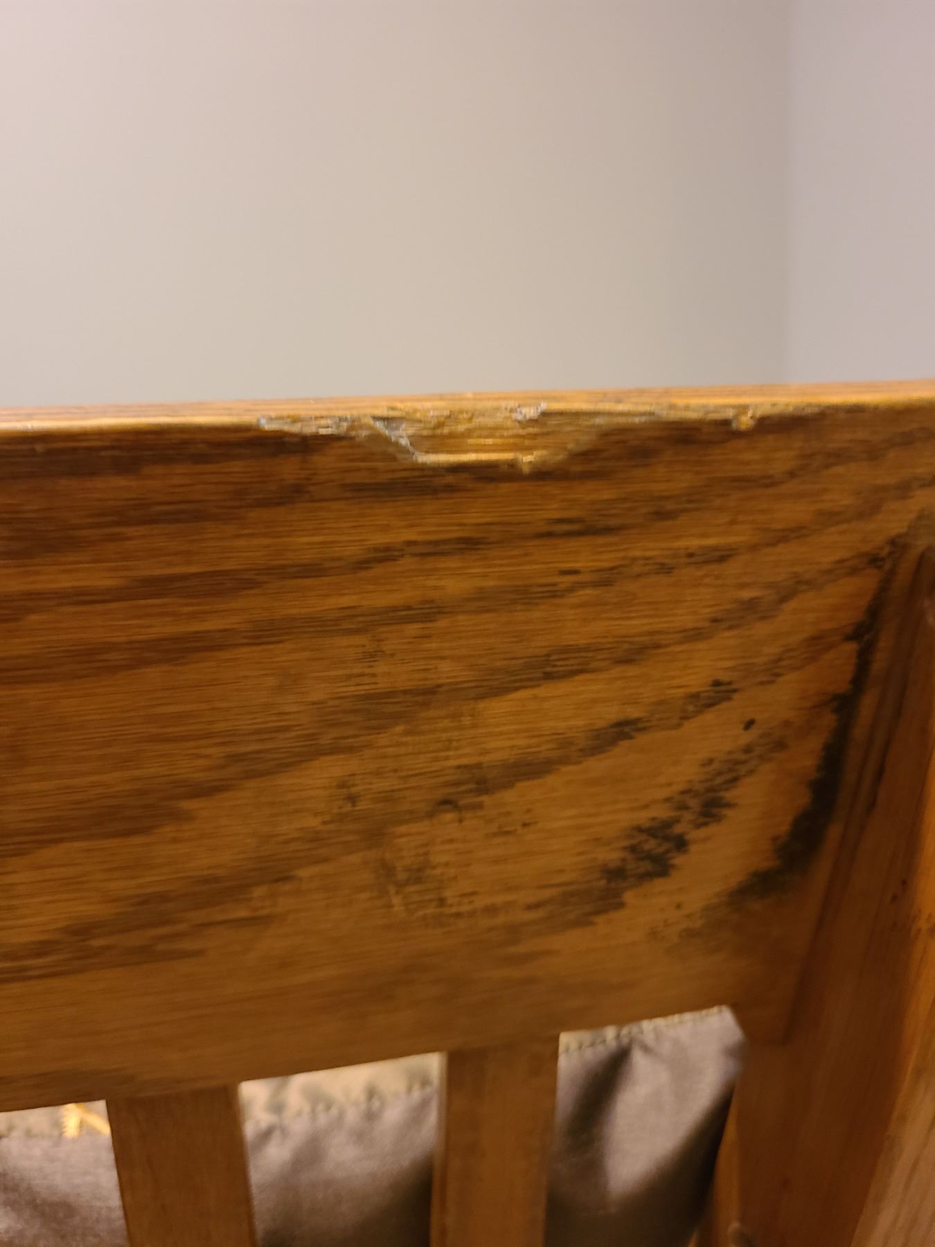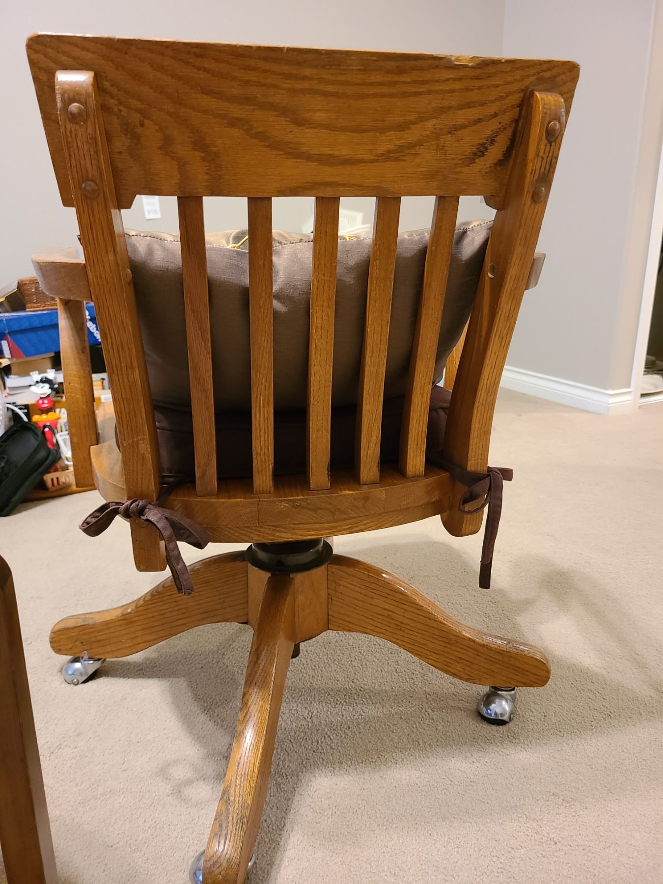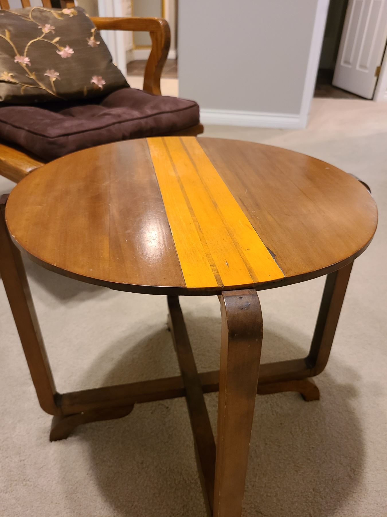 Rolling wood chair by Brooks Corning 21x19x32 with small round table 18x18x19. Chair has chip on back. Bring help to move. Pickup 11 am.
