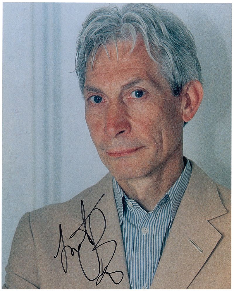 Two signed color glossy 8 x 10 photos, one of Charlie Watts signed in black felt tip; and one of Bill Wyman signed in black ballpoint by Wyman. In fine condition.