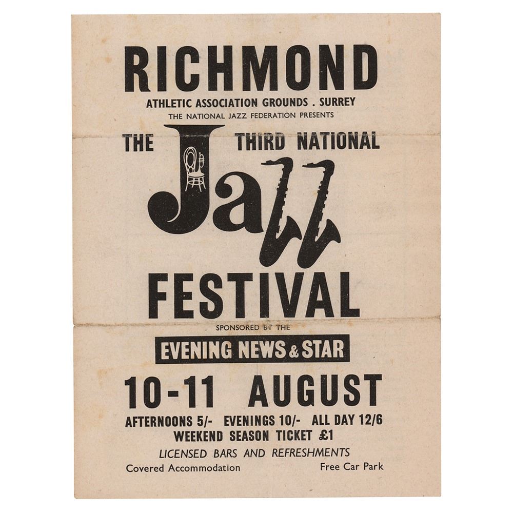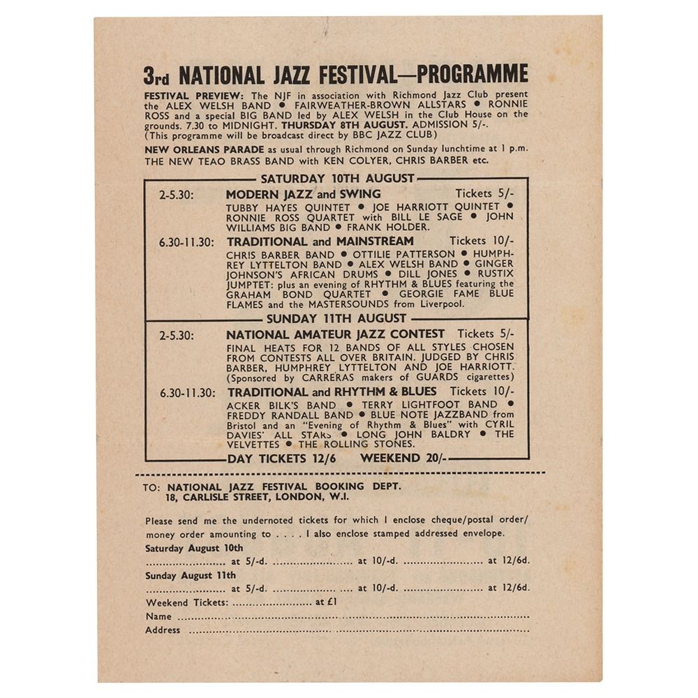 Scarce vintage dual-sided handbill 5.75 x 7.5 handbill promoting the 3rd National Jazz Festival at the Athletic Grounds in Richmond, Surrey, held on August 10-11, 1963. The Stones are slated to perform as part of the ‘Traditional and Rhythm & Blues’ portion on the August 11th show, which includes other acts like the Acker Bilk’s Band, the Terry Lightfoot Band, the Freddy Randall Band, and more. In fine condition, with two horizontal folds. Accompanied by a certificate of authenticity from Tracks.