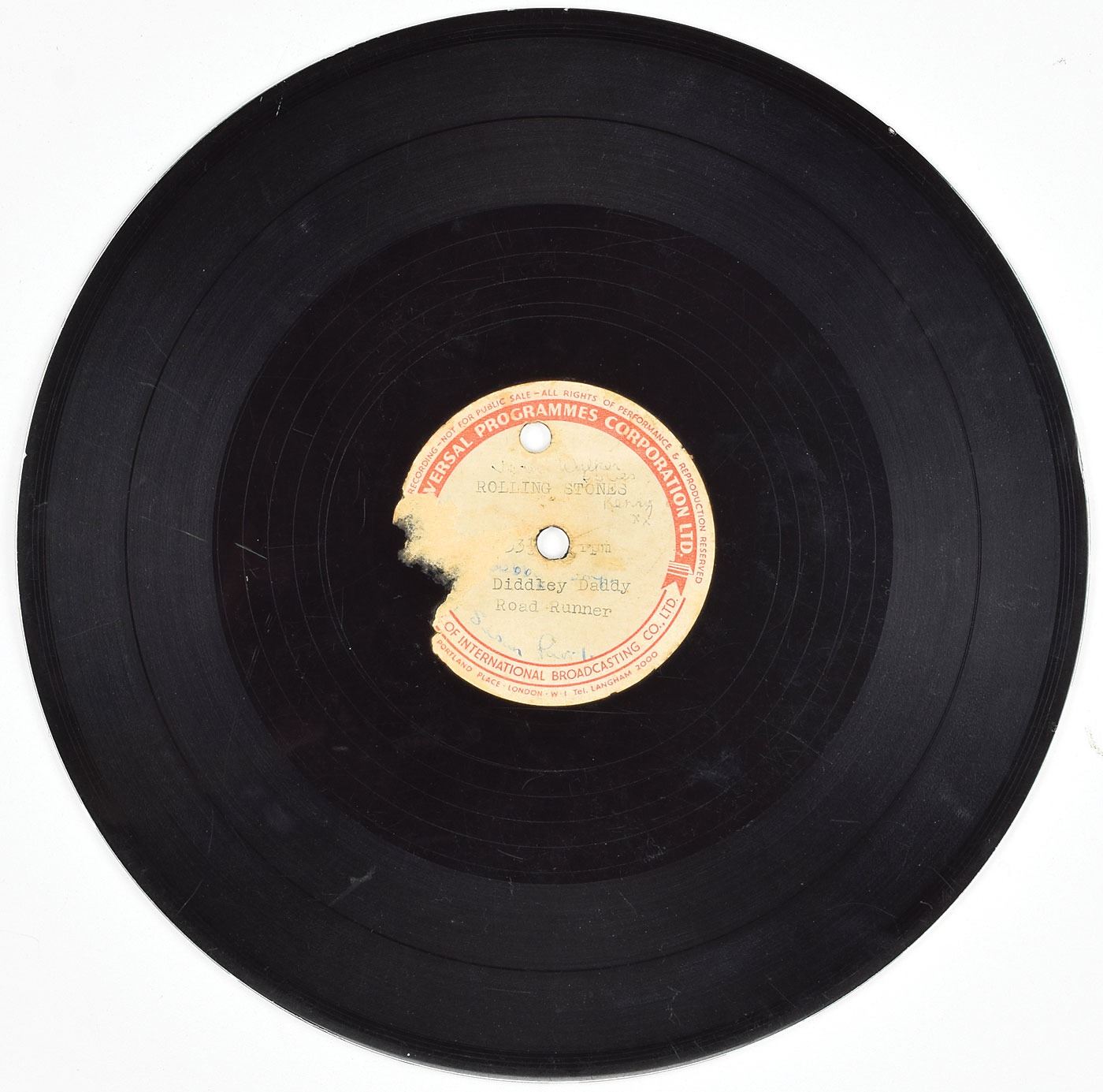 Exceptionally rare 10-inch acetate from the Rolling Stones’ first professional recording session, which took place on March 11, 1963, at Portland Place’s IBC Studios (International Broadcasting Company) in London, England. The acetate features a Universal Programmes Corporation Ltd. label, marked "Rolling Stones" and "33 1/3 rpm," with both sides annotated in an unknown hand and featuring a typed track listing that features the songs: “Diddley Daddy,” “Road Runner,” “Bright Lights, Big City,” “I Wanna Be Loved,” and “Honey, What's Wrong.” In very good to fine condition, with wear and paper loss to the labels; the acetate plays in good condition, without any skips or jumps but with some slight surface noise.