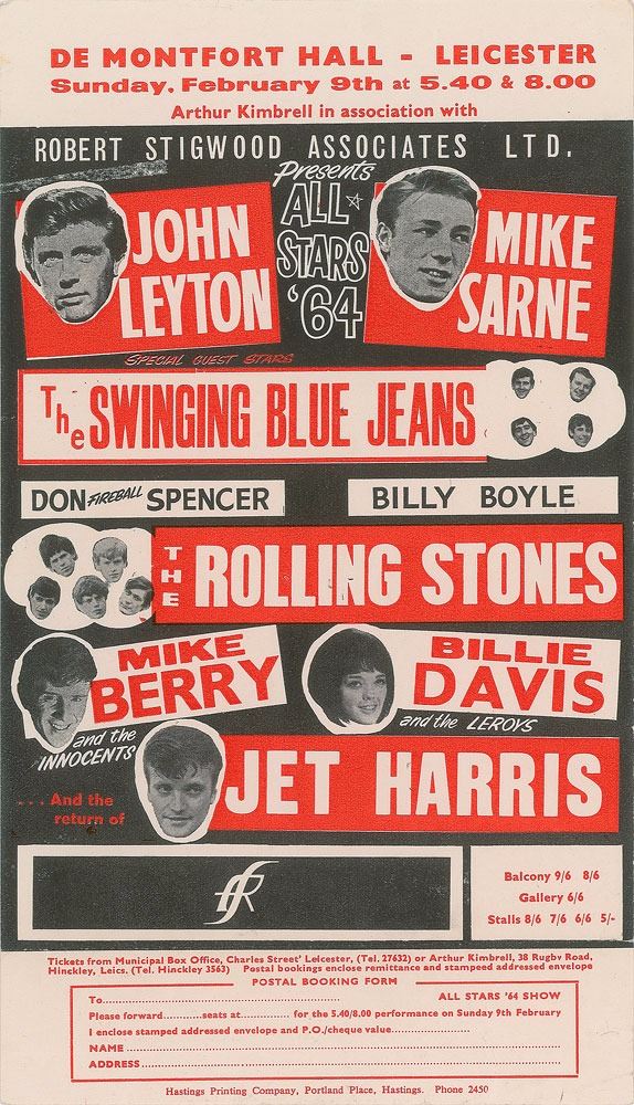 Vintage color 5.75 x 10 handbill for a Rolling Stones performance at De Montfort Hall in Leicester, England, on February 9, 1964. The "All Stars '64" concert is headlined by John Leyton and Mike Sarne, and lists several special guests, including: The Rolling Stones, The Swinging Blue Jeans, Don Fireball Spencer, Billy Boyle, Mike Berry and the Innocents, Billie Davis and the Leroys, and Jet Harris. In fine condition. Accompanied by a certificate of authenticity from Tracks. A stylish and vividly colored handbill dated two months before the Stones released their self-titled debut album.