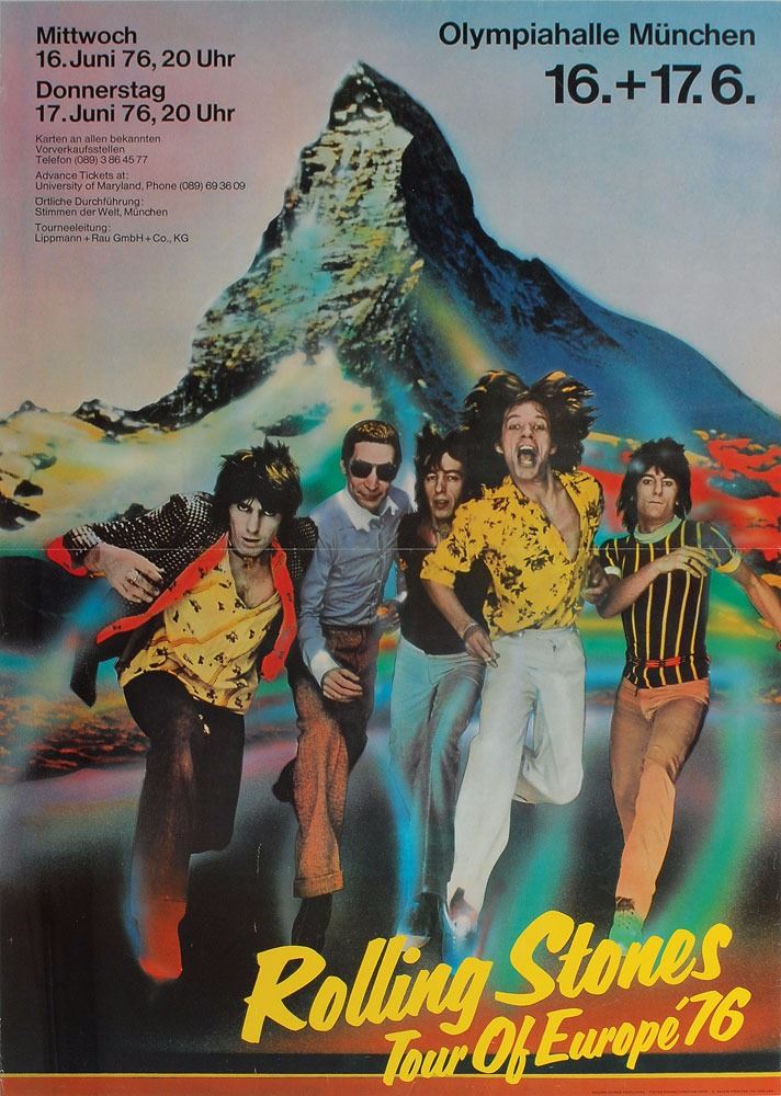 Appealing color 23.5 x 33 poster for two Rolling Stones concerts at Olympiahalle in Munich, Germany on June 16 and 17, 1976, depicting the band at the base of a large mountain, with text reading below, "Rolling Stones, Tour of Europe, '76." Rolled and in fine condition, with a central horizontal fold.