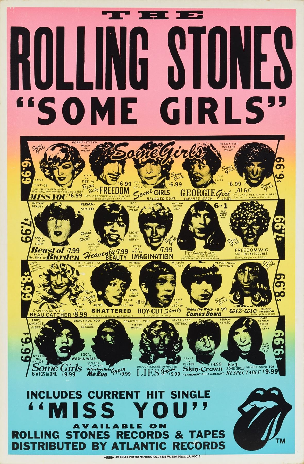 Scarce 14 x 22 cardboard boxing-style promotional poster advertising the Rolling Stones’ 1978 album Some Girls, featuring the withdrawn artwork depicting celebrities such as Marilyn Monroe, Lucille Ball, Farrah Fawcett, and others. Printed by Colby Posters of Los Angeles, these were posted on telephone poles around the city. This unused example was obtained from a former employee of the company hired to post them at the time of the album’s release; he said that they were only posted in Los Angeles, and when the Stones were threatened with lawsuits by some of the celebrities pictured on the album cover, they were quickly pulled down by his company. In fine condition.