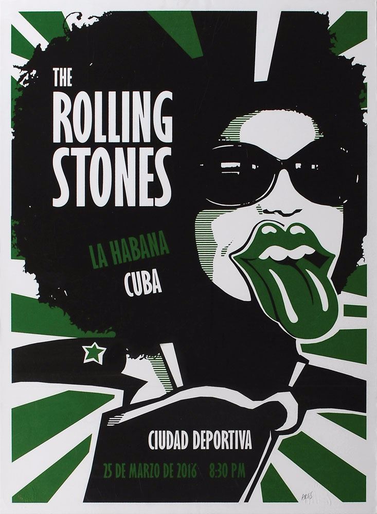 Original limited edition green-and-black 19.5 x 27.5 poster commemorating the Rolling Stones' historic concert at the Ciudad Deportiva in Havana, Cuba on March 25, 2016, numbered #2/50, blindstamped in the lower corners by Estudio Arnes. Rolled and in fine condition, with some surface scuffing. Designed by famed Cuban artist Aristides E. Hernandez and produced by Estudio Arnes, only a small batch of 50 were made.