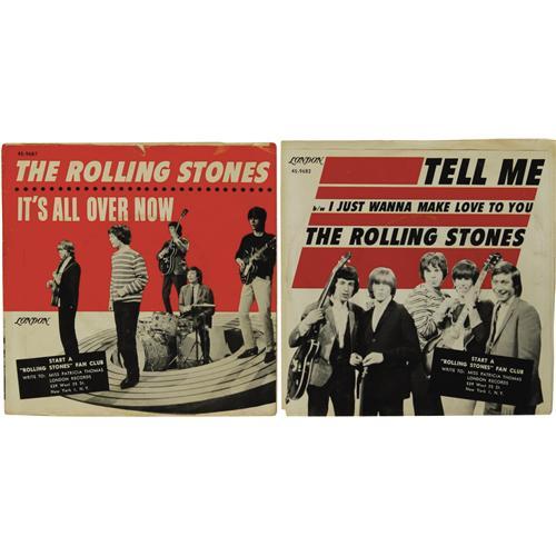 <B>Rolling Stones 45 and Picture Sleeve Group of 2 (London 1964).</B></I> Early, early Stones picture sleeves and discs, including "Tell Me"/ "I Just Wanna Make Love To You" (9682) and the classic rockin' "It's All Over Now"/ "Good Times Bad TImes" (9687). The "Tell Me" cover is a rare NM 8; the "It's All Over Now" cover grades a VG-EX 6, with some ring wear and stamps of "$75¢" and "R" on the front. Both discs grade EX 7.