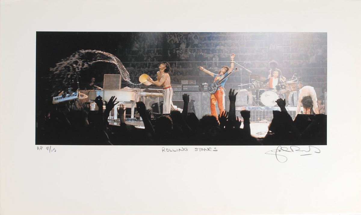 Color limited edition 19 x 13 artist’s proof print showing the Rolling Stones in concert, numbered AP 9/15, signed in the lower border in pencil by photographer John Rowlands. In fine condition.
