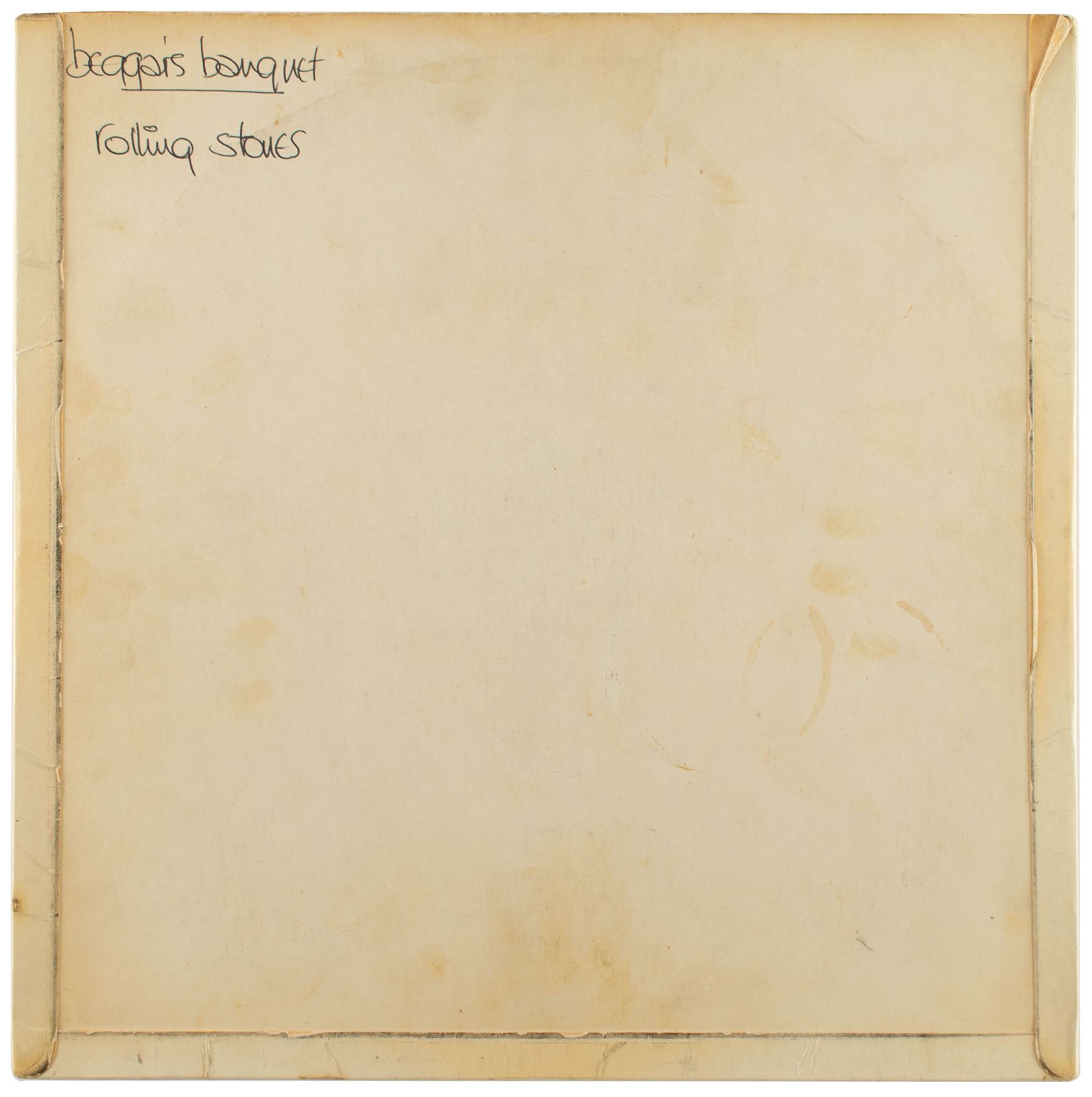 Double-sided 12˝ Emidisc stereo acetate for the 1968 Rolling Stones album Beggars Banquet, filled out on the labels in ballpoint: "Beggar's Banquet, Side #1 Stereo, Rolling Stones" and "Beggar's Banquet, Side #2 Stereo, Rolling Stones." Complete with its original sleeve, marked "Beggar's Banquet, Rolling Stones," in the same hand. In very good to fine condition, with toning, soiling, and light staining to the covers. The acetate was formerly the property of Rolling Stones Fan Club secretary Shirley Arnold, who was given the disc by the band on the day of the launch party on 5th December 1968; accompanied by a handwritten letter from Shirley Arnold, which reads: “The band gave me this acetate on the day of the launch party for the album. Where many a custard pie was thrown!” Also includes a certificate of authenticity from Tracks.