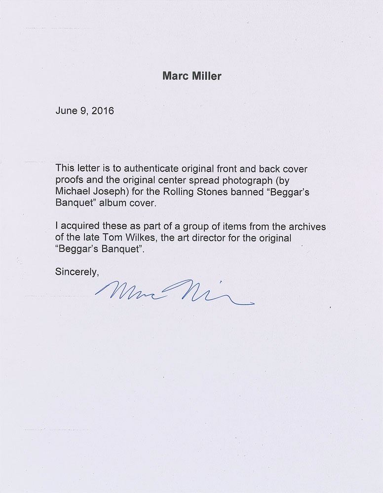 Incredibly rare album cover proofs for the front and back of the Rolling Stones' masterpiece Beggars Banquet, using the unreleased 'toilet' artwork, from the portfolio of legendary art director Tom Wilkes, who—with Michael Vosse, Barry Feinstein, Mick Jagger, and Keith Richards—came up with the design. Each cover slick measures 12.5 x 12.75 and has a small piece of adhesive on the reverse. This is the proof for the would-be US release by London Records, and has the "London" logo and catalog number ("Stereo, PS539") at the top of the front cover. In overall fine condition, with aforementioned adhesive residue to reverse and two tiny creases to the left edge of the slick for the front cover. In the 49 years since this album has been released, perhaps five album cover proofs for the original artwork have surfaced—these are likely the ones in best condition. These original proofs were carefully preserved by Wilkes and included in his portfolio, a large book of his designs used to show potential clients; two images of the portfolio are included. Also accompanied by a letter of provenance stating that these were acquired from Wilkes's archive. These slicks are oversized, larger than a final printed album cover; the artwork would have been cropped for final use. As a result, they display more of the photograph, including on the front cover a bit more writing at the top, the full toilet paper roll at the left, extra wall on the right, and more of the toilet seat at the bottom.