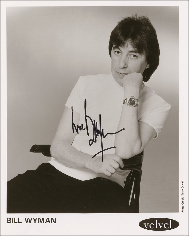 Glossy 8 x 10 Velvel publicity photo, signed in black felt tip, “Bill Wyman.” In fine condition, with a few small surface creases.