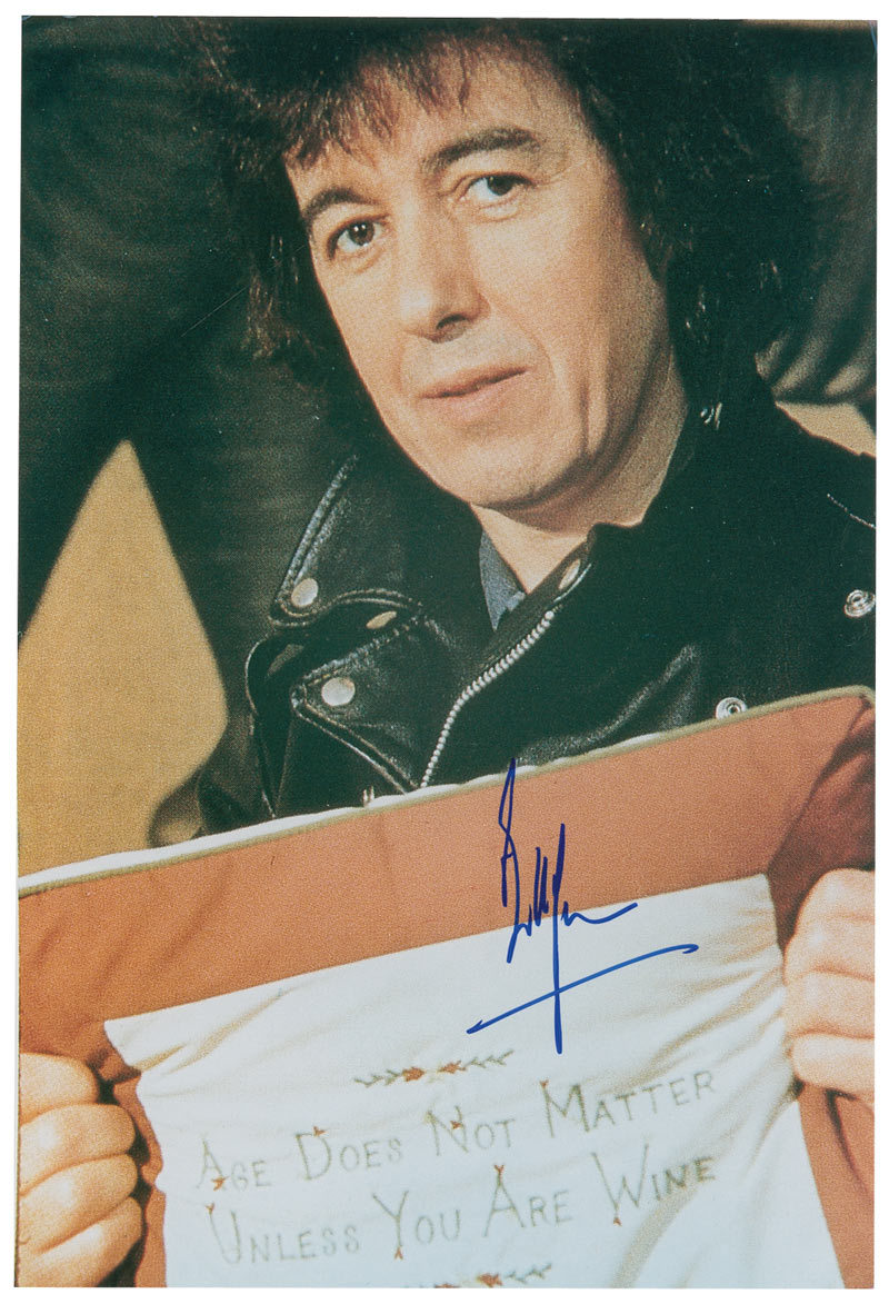 Color glossy 8 x 12 photo of Wyman holding up an embroidered pillow extolling the virtue of age, signed in blue felt tip. In fine condition.