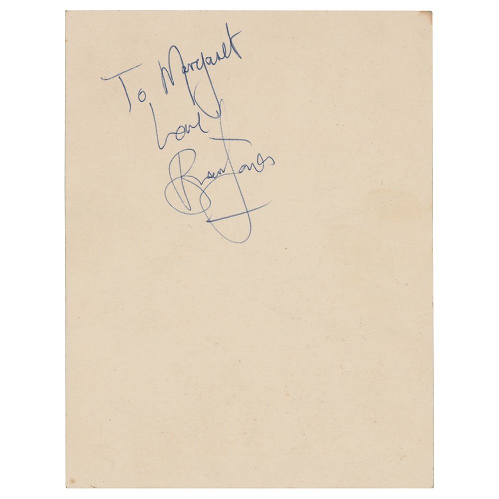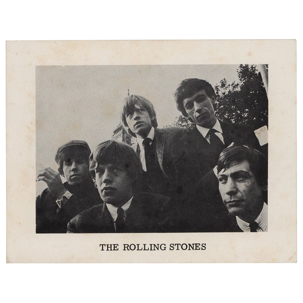 Vintage Decca Records promotional card for The Rolling Stones, 5.5 x 4.25, signed and inscribed on the reverse in blue ballpoint, "To Margarete, Love, Brian Jones." In fine to very fine condition, with faint soiling to the image. Accompanied by a certificate of authenticity from Tracks.