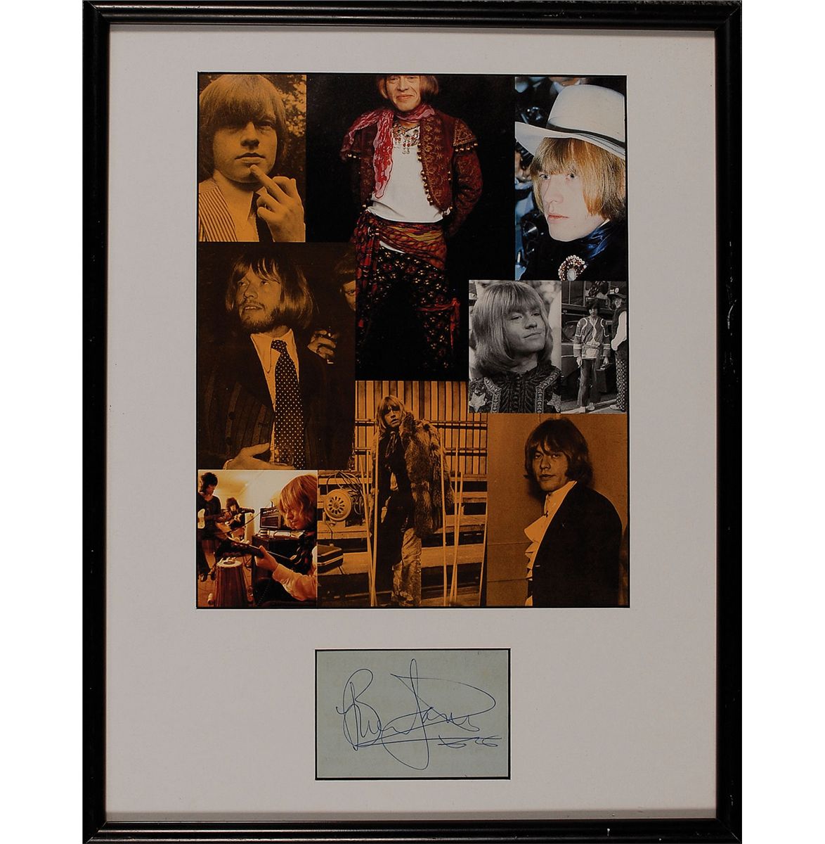 Founding member, lead and rhythm guitarist and backing singer in the English rock group, The Rolling Stones. He drowned in 1969 after leaving the band, with the coroner stating the cause was “death by misadventure.” Robust vintage ballpoint signature, “Brian Jones,” on a blue 4.25 x 2.75 album page. Matted and framed, with a color composite photo of Jones, to an overall size of 14.5 x 18.25. In fine condition.