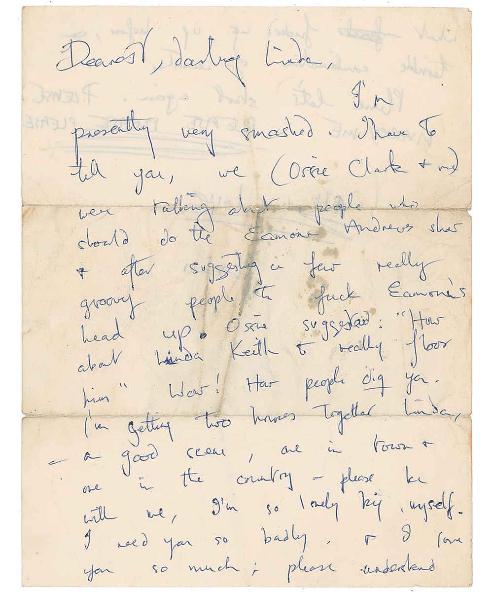 As Brian Jones’s substance abuse spiraled out of control, his place in the Rolling Stones became less and less clear. In March 1967, after hitting girlfriend Anita Pallenberg while on tour in Marrakesh, Jones found himself hospitalized and alone. Pallenberg left him for bandmate Keith Richards, and in response, Jones began dating Richards’s ex-girlfriend Linda Keith, further damaging the already strained relationship. Both heavily addicted to drugs and explosive in temperament, they made an intense and destructive couple. Well-known among musicians, Linda Keith played a major role in discovering Jimi Hendrix and also served as the inspiration for the song ‘Ruby Tuesday.’ Retelling a conversation with quintessential Swingin’ Sixties designer and fellow party animal Ossie Clark about getting Keith on the popular Eamonn Andrews show, Jones gushes over Linda. This rambling letter, written towards the end of his time with the Stones, illustrates the passion and desperation that characterized his final years. An intimate look at the private thoughts of a musical legend.