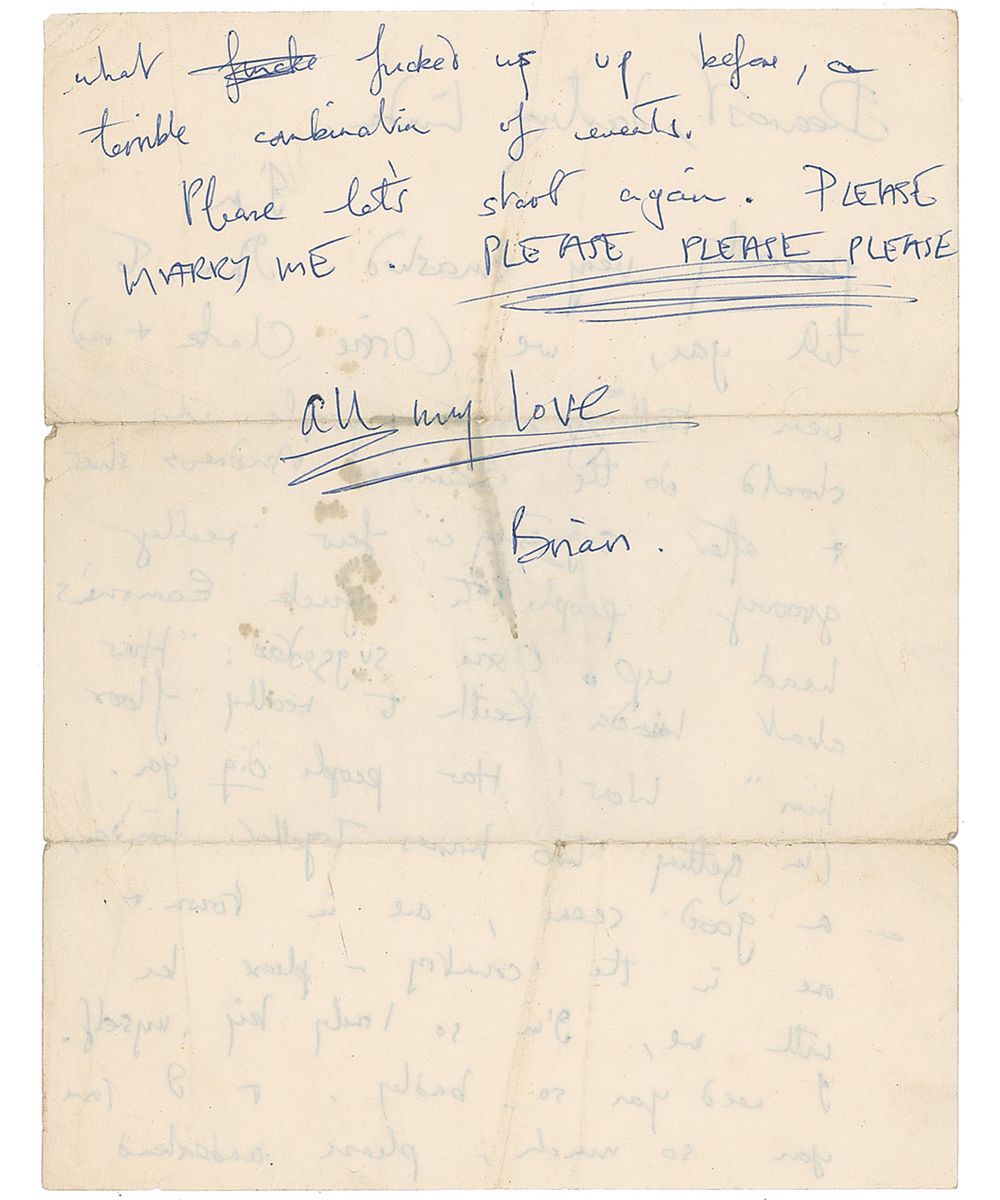 ALS signed “Brian,” one page both sides, 7 x 9, no date, but circa 1968. Letter to Linda Keith beginning “Dearest, darling Linda.” In full: “I'm presently very smashed. I have to tell you, we (Ossie Clark and I) were talking about people who should do the Eamon Andrews show and after suggesting a few really groovy people to fuck Eamon's head up, Ossie suggested ‘How about Linda Keith to really floor him’ Wow! How people dig you. I'm getting two houses together Linda, a good scene, one in town & one in the country—please be with me, I'm so lonely by myself. I need you so badly & I love you so much, please understand what fucked us up before, a terrible combination of events. Please let's start again. PLEASE MARRY ME. PLEASE PLEASE PLEASE.” In very good condition, with intersecting folds and creases, scattered light staining, not affecting the legibility, and some wrinkling. Provenance: Christies, New York, 2007.