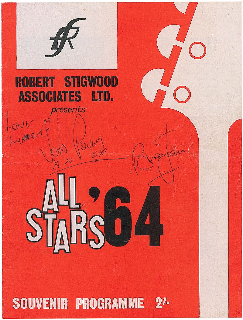 All Stars ’64 rock and roll show souvenir program, 8.5 x 11, signed on the front cover in blue ballpoint by Jones, and also signed and inscribed on the front cover by Fenmen drummer Jon Povey. Program is also signed inside by Jet Harris, a member of the LeRoys, and two more members of the Fenmen. In very good condition, with at least one page missing from inside (biographies of the Rolling Stones), a central horizontal fold, and scattered creasing and handling wear.