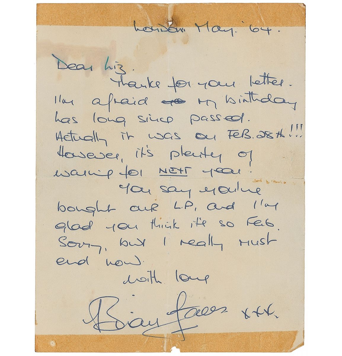 ALS signed “Brian Jones xxx,” one page, 5.25 x 7, May 1964. A playful letter to an admirer. In full: “Thanks for your letter. I’m afraid my birthday has long since passed. Actually it was on Feb. 28th!!! However, it’s plenty of warning for next year! You say you’ve bought our LP, and I’m glad you think it’s so fab. Sorry, but I really must end now.” In very good condition, with central vertical and horizontal folds (vertical fold passing between his first and last names), toned tape to top and bottom edges, and staining near the top. This early letter references the band’s very first album, The Rolling Stones, which was released by Decca Records in the UK on April 16, 1964.