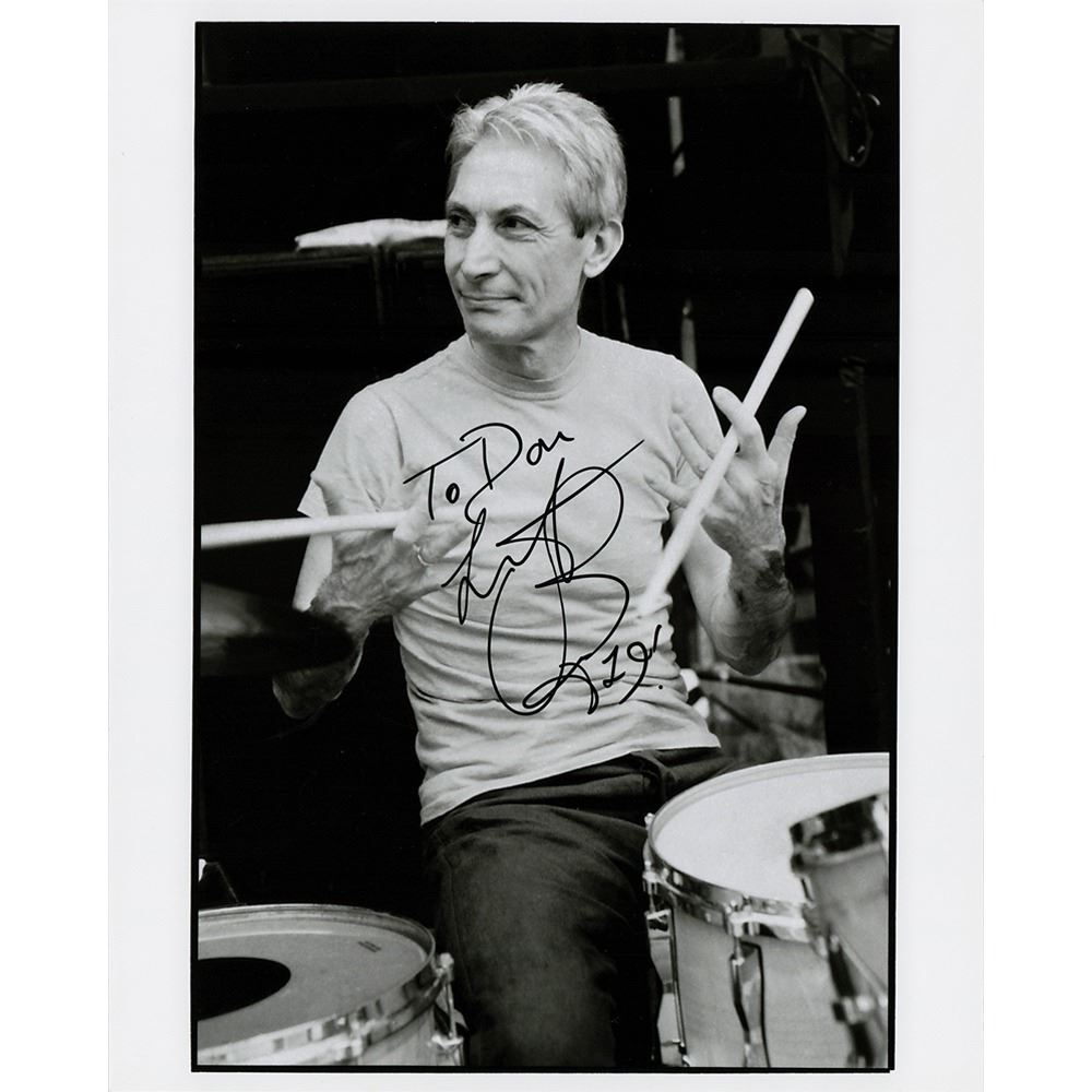 Glossy 8 x 10 photo of Rolling Stones drummer Charlie Watts behind his kit, signed and inscribed in black felt tip ("To Dan"), and dated 2019. In very fine condition.