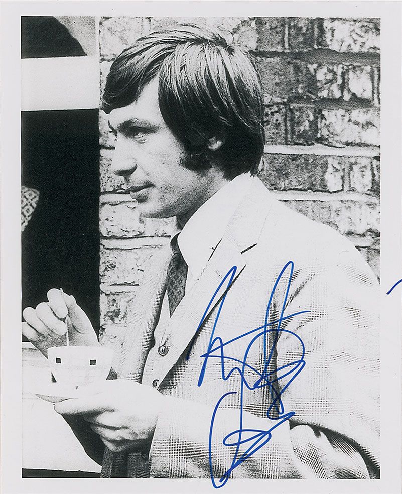 Satin-finish 8 x 10 photo of Watts in a suit and tie holding a cup of tea, signed in blue felt tip. In very fine condition.