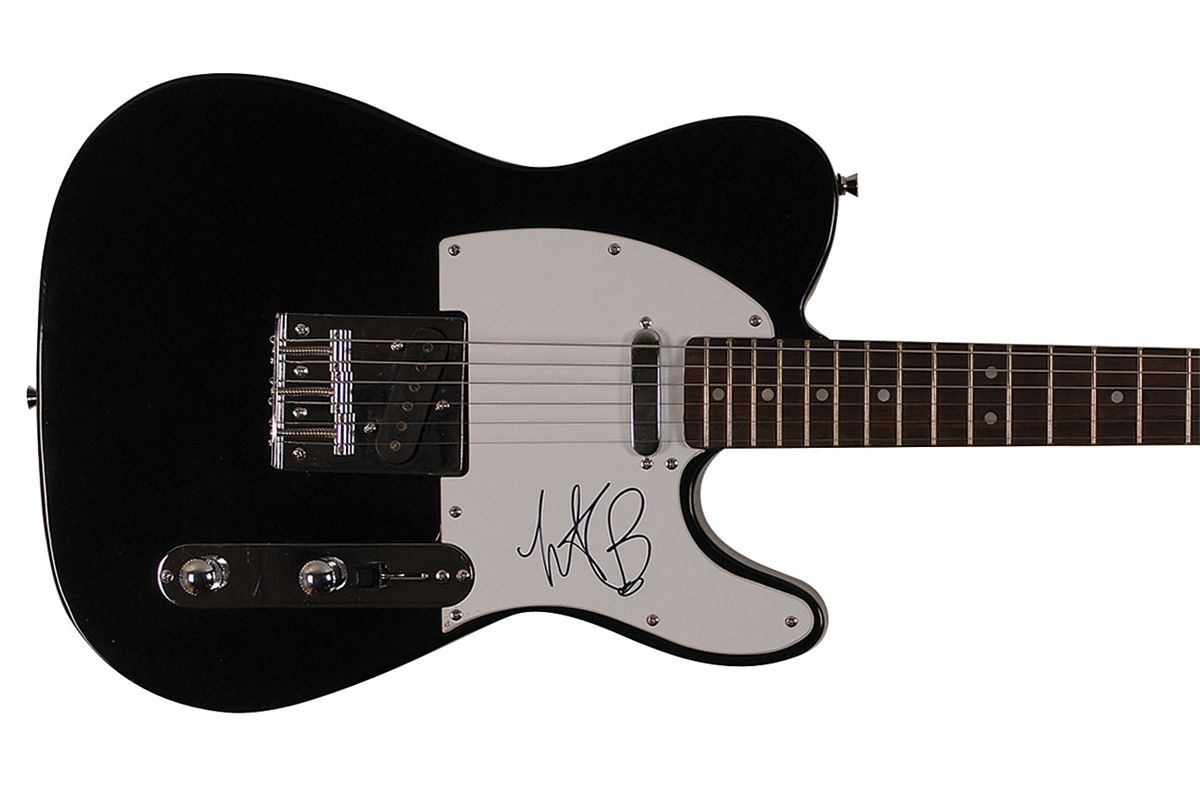Very presentable black-bodied Stedman Pro ‘telecaster-style’ electric guitar, signed on the white pickguard in black felt tip. In fine condition. Oversized.
