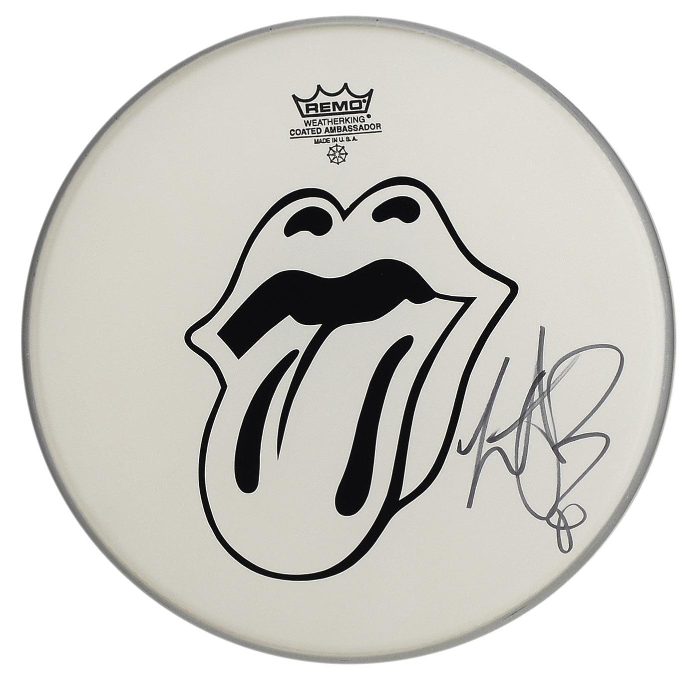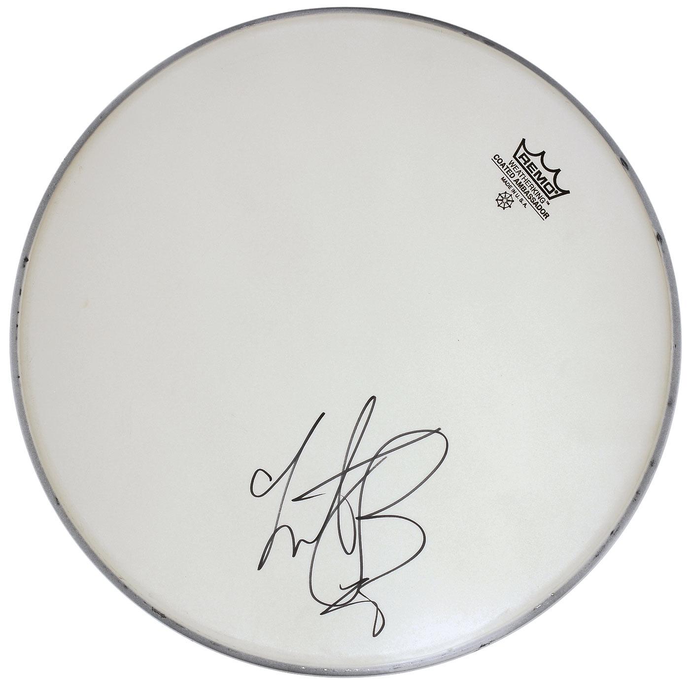 Two unused Ambassador coated Remo drumheads, one 12” and one 14”, each signed in black felt tip. In very fine condition.