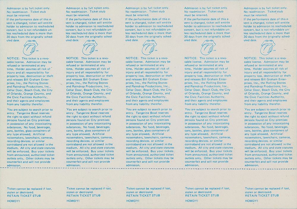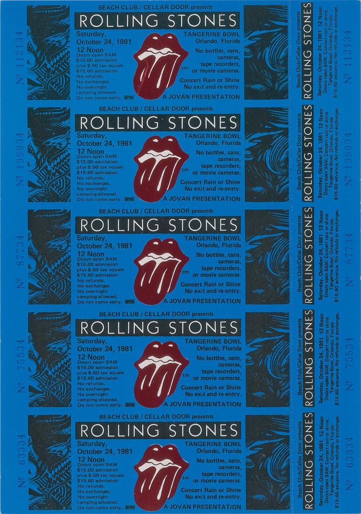 A beautiful unperforated 7.5 x 10.75 sheet of five blue tickets for a Rolling Stones concert at the Tangerine Bowl in Orlando, Florida, on October 24, 1981, featuring red foil-embossed Rolling Stones ‘tongue’ images. In fine condition.