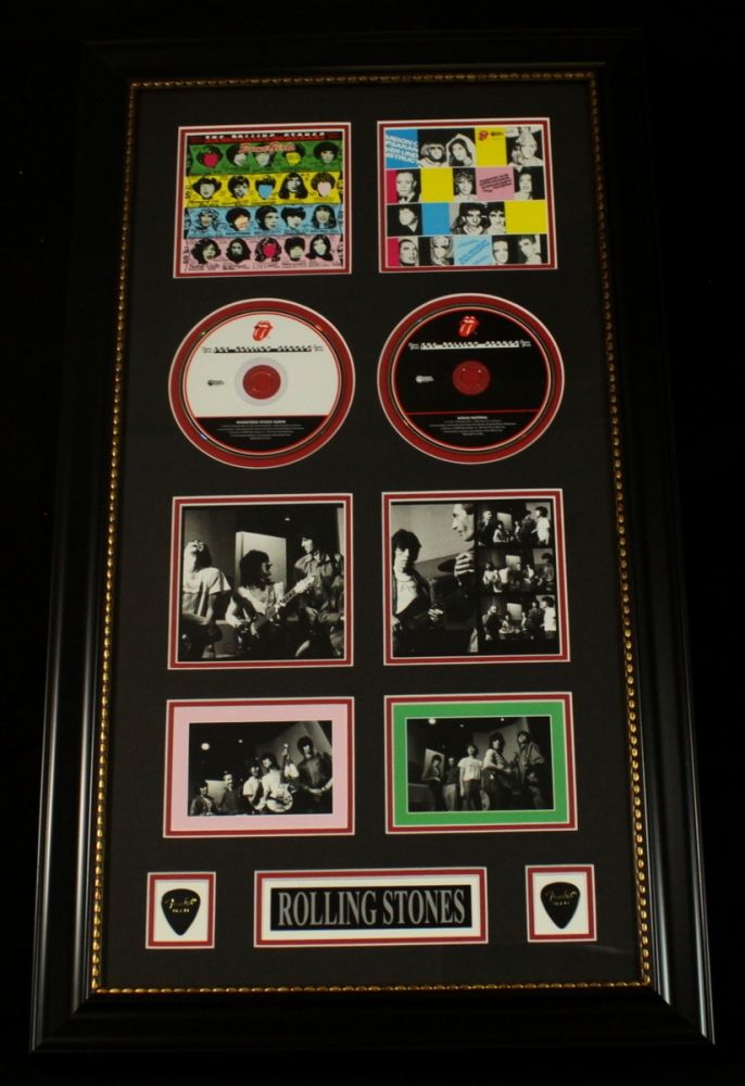Beautiful custom matted and framed piece. The piece measures 17" x 30" in size and is highlighted by two fender guitar picks and two Rolling Stones CDs.