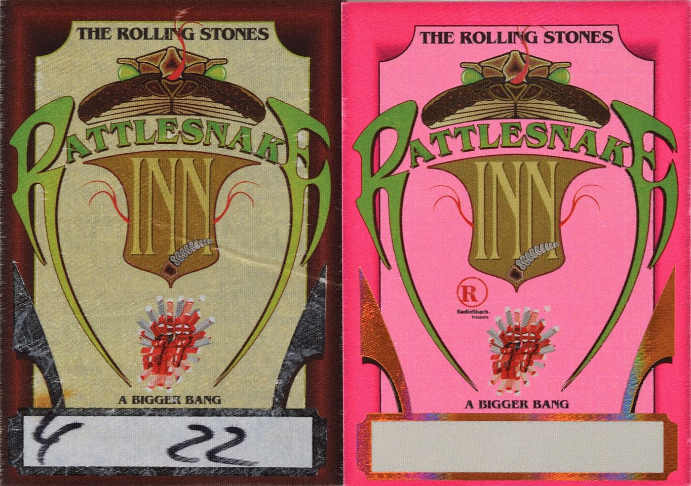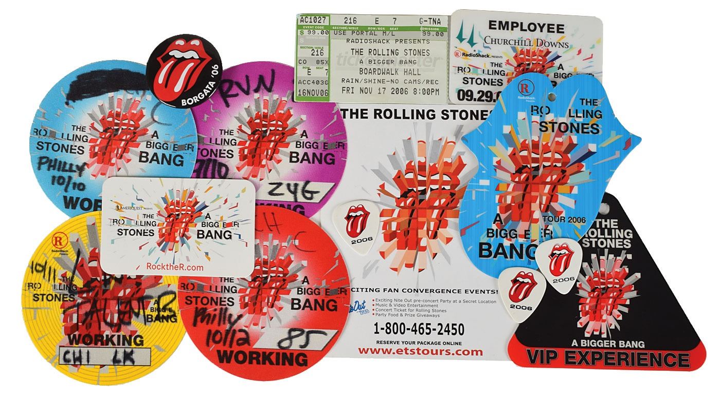 Impressive collection of 22 items relating to the Rolling Stones’ 2005–2007 A Bigger Bang Tour, which is highlighted by three CD booklets individually signed and inscribed in silver ink by Keith Richards (Talk Is Cheap), Charlie Watts (Long Ago & Far Away), and Ronnie Wood (Ronnie Wood Anthology: The Essential Crossexion), with each adding an inscription to “John.” Other items include: a pair of backstage sticker passes, one unused, for admittance into the Stones' legendary backstage entertainment area, known as The Rattlesnake Inn, the used pass dated April 22; a group of four unused multicolored “Working” backstage sticker passes, with two marked for stops in Chicago on September 10, 2005 and October 11, 2006, and two marked for Philadelphia on October 10 and 12, 2005; a blue “Hot Seat” ‘tongue and lip’ backstage pass for the 2006 tour; a black-and-red “VIP Experience” triangular backstage pass; an “Employee” access card for the Stones concert at Churchill Downs in Louisville, Kentucky, on September 29, 2006; a set of four white guitar picks, the front of each bearing the ‘tongue and lip’ logo, and the reverse of each bearing different text: “Bigger Bang 2005,” “The Rolling Stones,” “Mick Jagger,” and “Ronnie Wood”; a black “Borgata ‘06” pin with ‘tongue and lip’ logo; a ticket stub and set list for the Stones concert at Boardwalk Hall in Atlantic City, New Jersey, on November 16, 2006; a black laptop bag with the “A Bigger Bang Tour” logo; and an ETS promo card and a Harman Kardon marketing card for Rolling Stones events. In overall fine condition.
