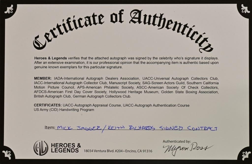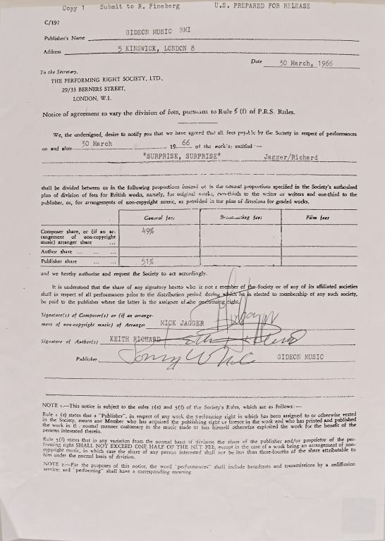 The Rolling Stones Mick Jagger and Keith Richard signed Gideon Music BMI contract. March 30, 1966. 9x12 inches. DB625