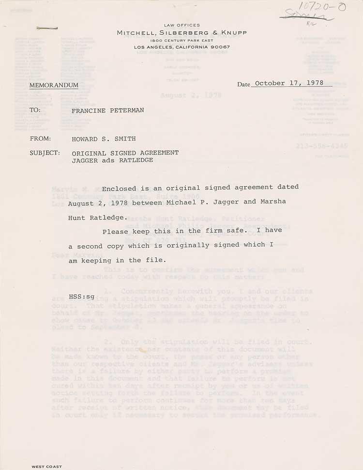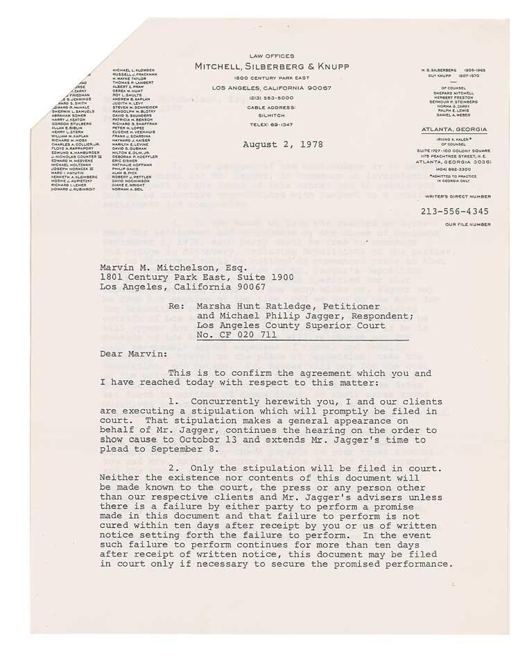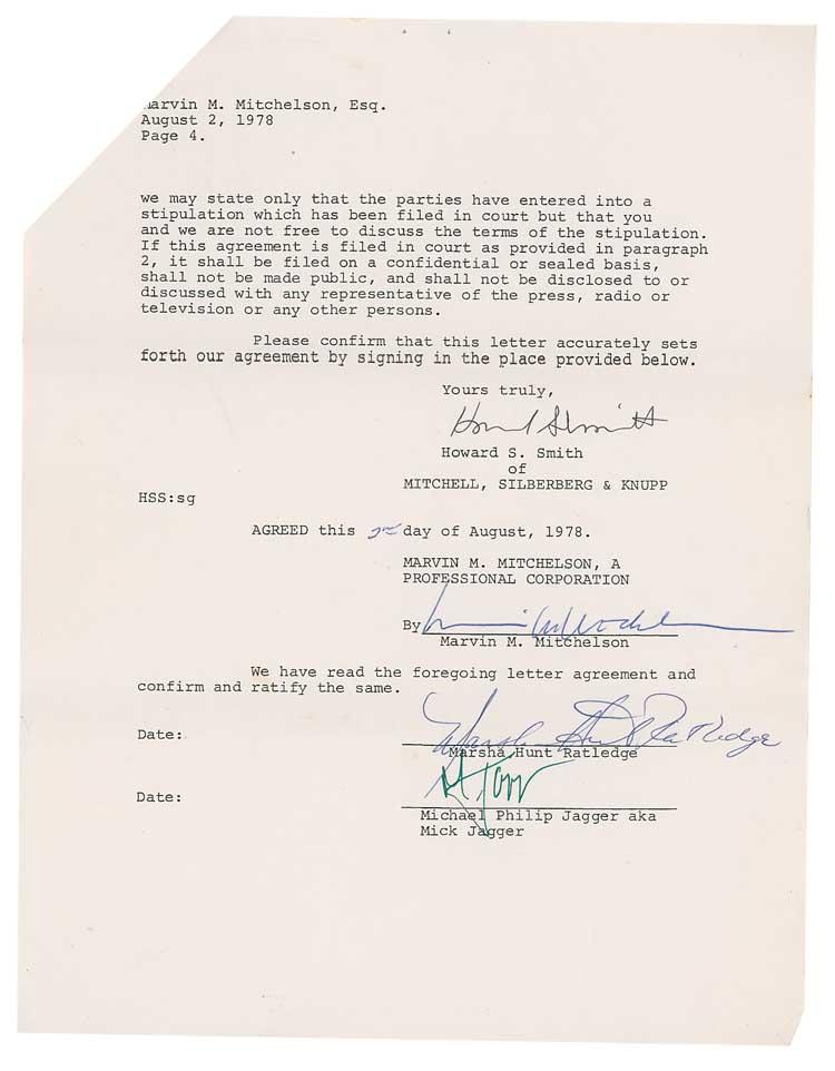 DS, four pages, 8.5 x 11, August 2, 1978. The agreement between Michael P. Jagger and Marsha Hunt Ratledge regarding the care of their daughter Karis Hunt Ratledge. The nine point document reads, in part: “Neither the existence nor contents of this document will be made known to the court, the press or any person other than our respective clients and Mr. Jagger’s advisers…Mr. Jagger shall pay for the benefit and care of Karis Hunt Ratledge the sum of Three Thousand Dollars ($3000.000) by check…You and Mrs. Ratledge agree that the fact of this payment and the amount of the payment shall not be disclosed to any other person except as set forth in this agreement…The payment by Mr. Jagger…is solely for the purpose of avoiding the expense and publicity of a hearing…In the event the parties are unable to reach an agreement of compromise, the Three Thousand Dollars…being paid by Mr. Jagger shall be credited against any award…There shall be no publicity or public or private statement made by or on behalf of any party or attorney to any other person except by Mr. Jagger.” Signed on the last page in green ink by Jagger, as well as Marsha Ratledge. In fine condition, with expected folds, several creases, and staple to top left.